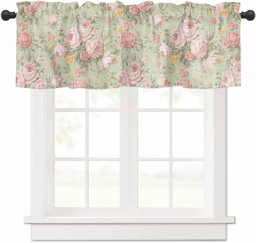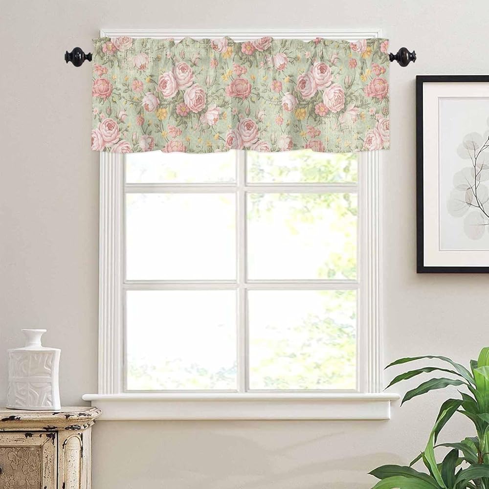 Yukro Valance for Windows Vintage Flower Pink Camellia Floral Sage Green Privacy Rod Pocket Window Treatment Valance Decorative Short Curtain Valance for Kitchen/Living Room/Bedroom 54x18in