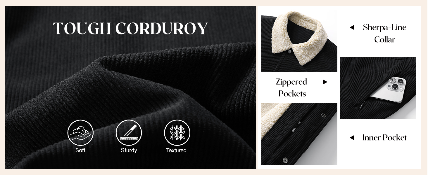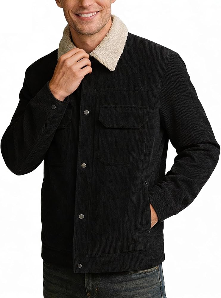 The men's casual jacket is made of corduroy fabric with a Sherpa pile lining. To make the jacket wearable during the cold winter months. Plush lapels enhance the sense of fashion and vintage.