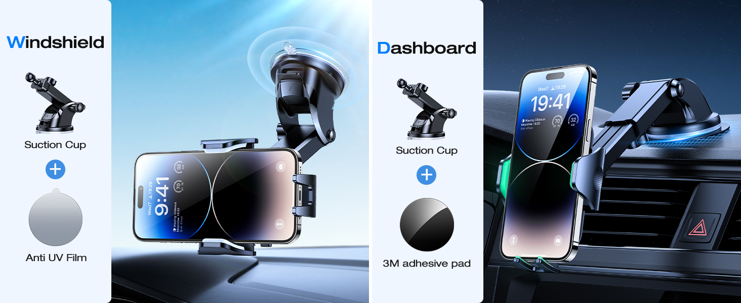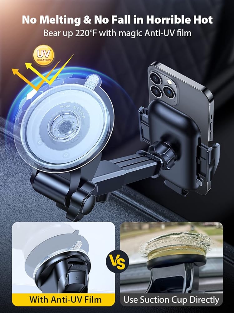 Comparing use the suction cup directly on the window, this windshield car mount with Anti-UV film solve all the suction problem of melting & falling, extend the longer lifetime and keep your window clean away from the ugly mark