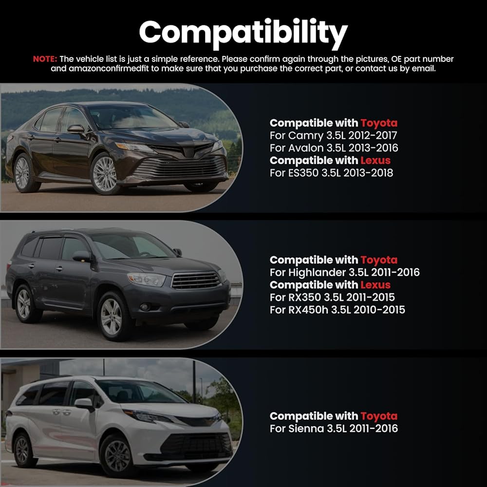 Fitment Model: Compatible with Toyota Camry 3.5L 2012-2017, for Highlander 3.5L 2011-2016, for Sienna 3.5L 2011-2016, for Avalon 3.5L 2013-2016
