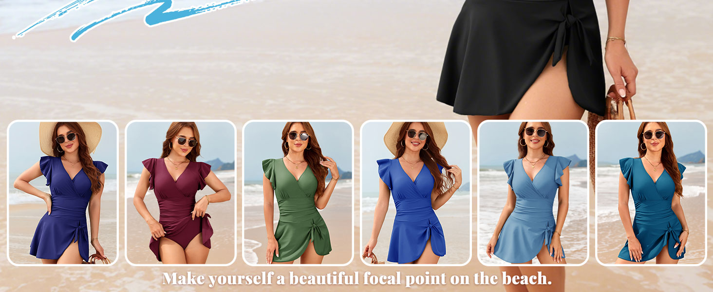 The V-neckline of swimdress swim suits for women 2026 works wonders to elongate your neck and torso, creating a universally flattering silhouette. A delicate tie knot at the front of swim skirts adds a touch of playful charm. Paired with the skirt and ruffled sleeves, this suit offers a perfect balance of allure and coverage, gracefully skimming over your curves.