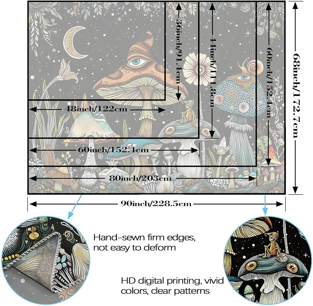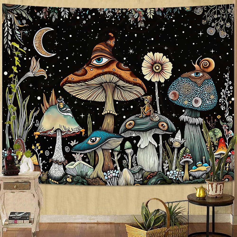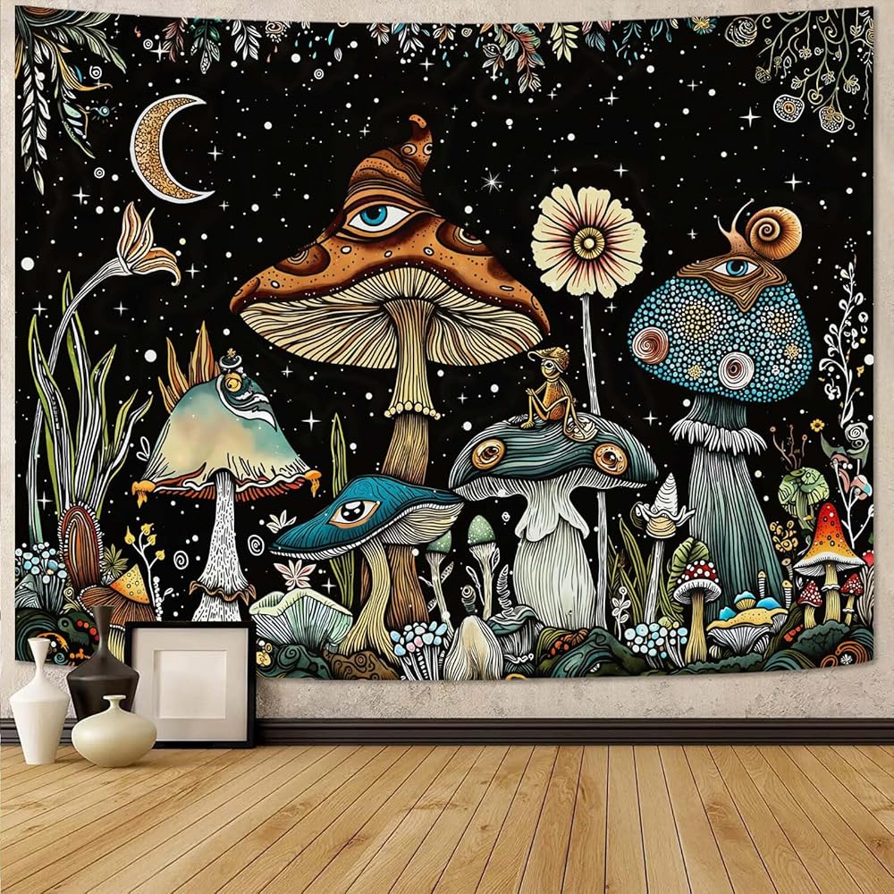 Our mushroom tapestry collection has 7 enchanting designs, featuring vibrant eye-adorned mushrooms, cosmic elements (moons, stars, nebulae) and lush natural landscapes on starry black backdrops. Made from soft, durable polyester and available in 4 sizes, these hippie-style tapestries are practical for bedrooms, dorms, living rooms and outdoor settings