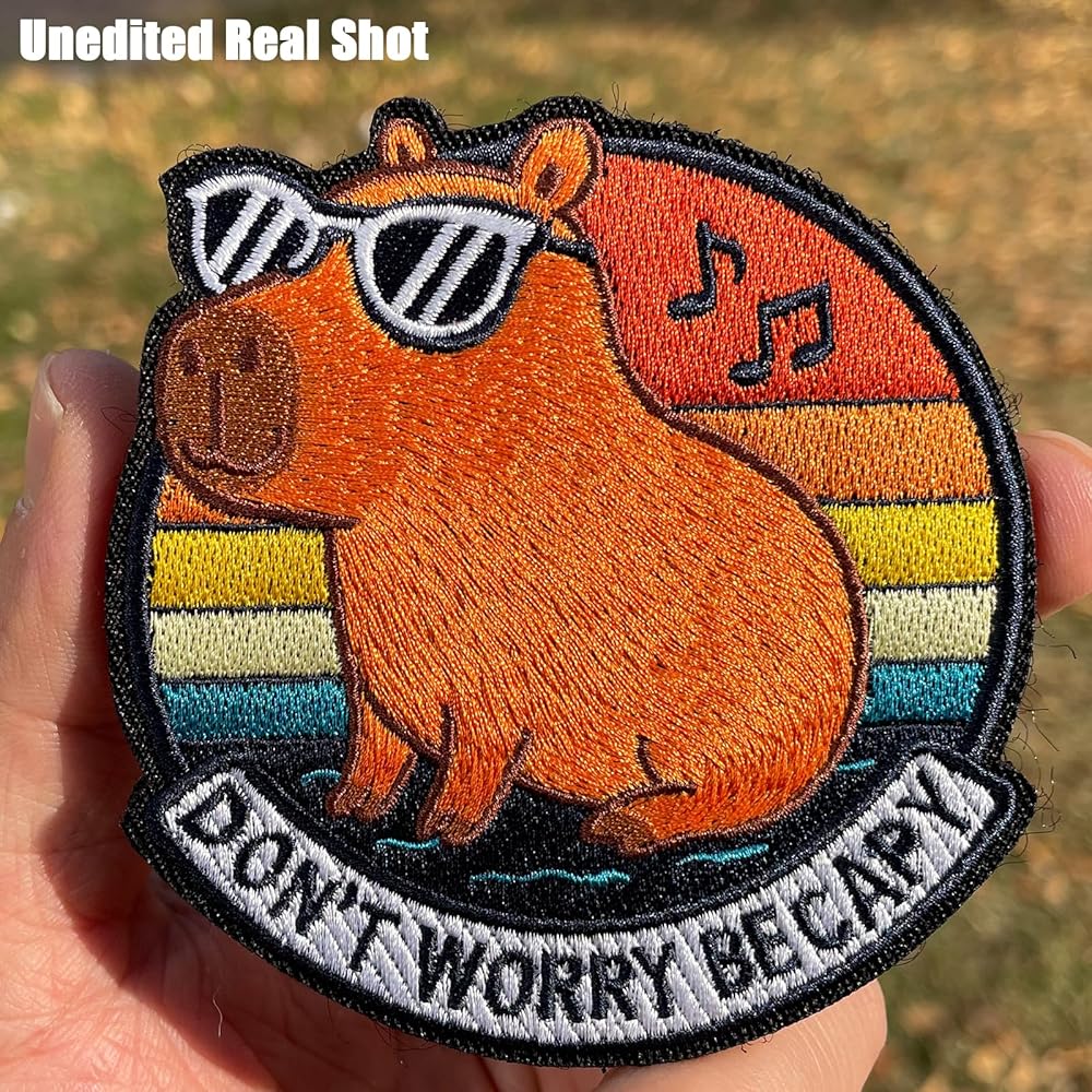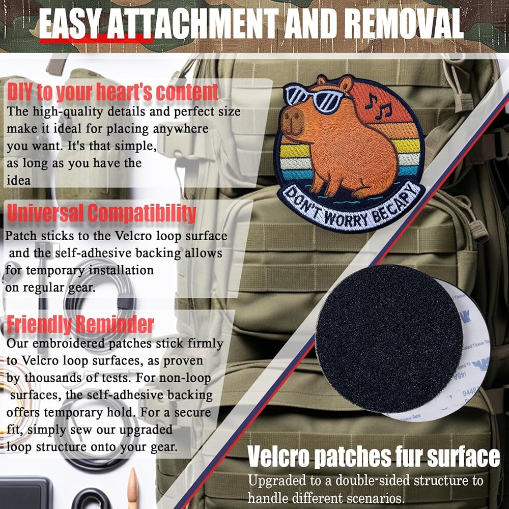 Laid-Back, Calm Energy Design: This morale patch features a relaxed capybara wearing sunglasses, set against a warm retro sunset with floating music notes and the phrase “Don't Worry Be Capy.” It's a cute, funny animal patch that captures that unbothered, go-with-the-flow mindset—quietly chill, effortlessly cool, and immune to unnecessary stress.