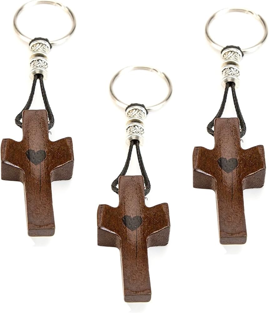 Cross Keychain: This 3-pack Christian keychain set features 2×1 inch small wooden crosses — each cross has a subtle heart detail, embodying faith and comfort. The natural wood texture adds a warm, timeless touch to these jesus keychain pieces.