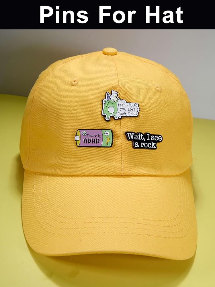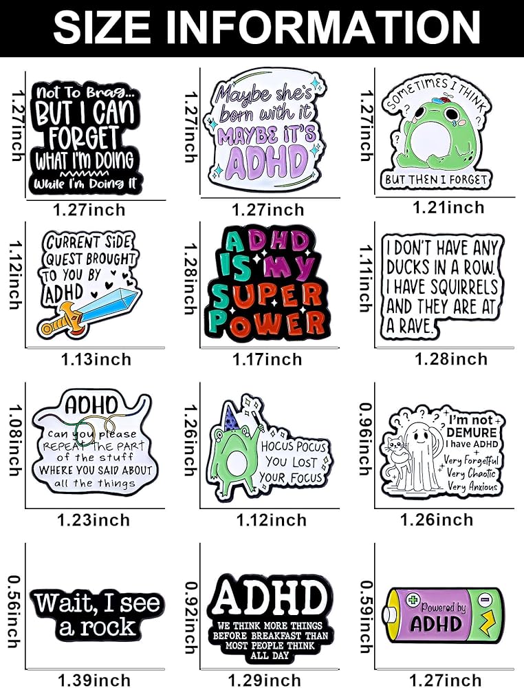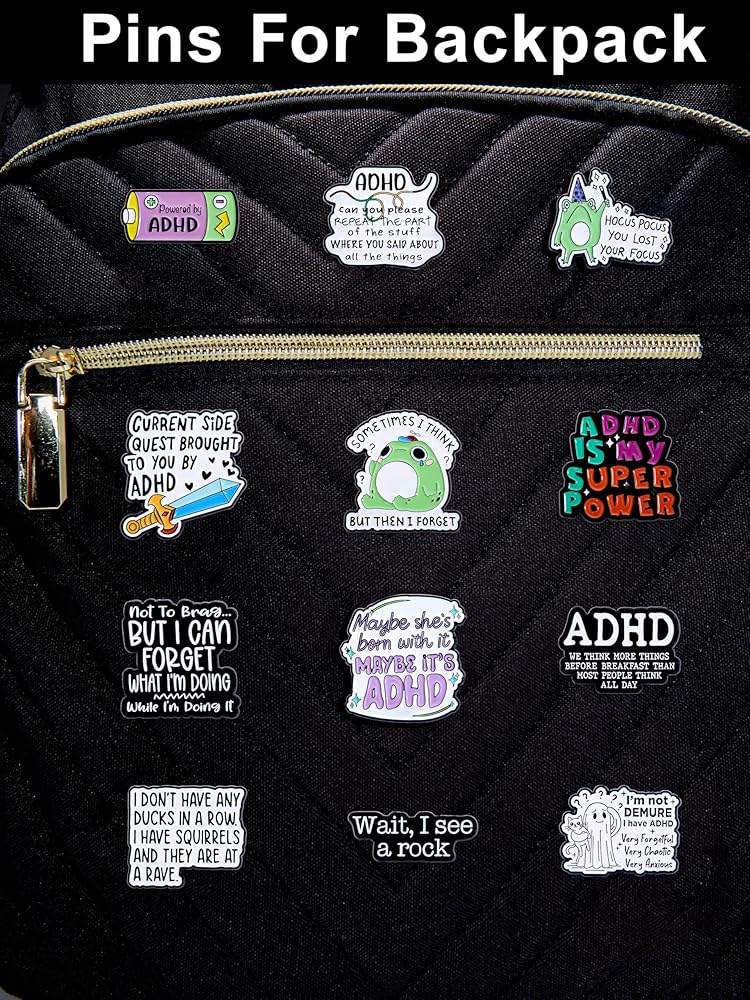 Add personality to your everyday look with a twelve-piece quote pin assortment designed for relatable humor and self-expression. Each piece features bold, easy-to-read text and cartoon styling, including designs that contain ADHD wording and everyday distraction jokes.