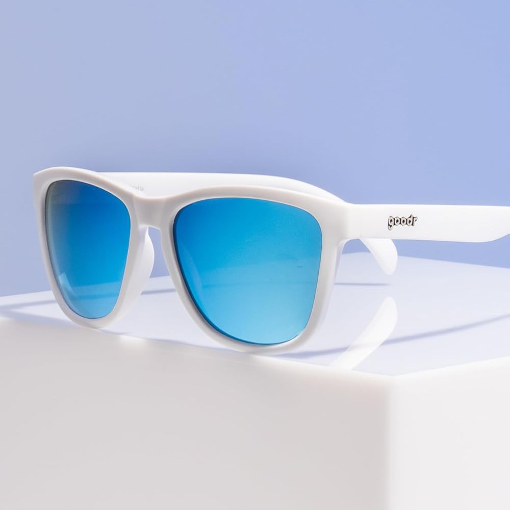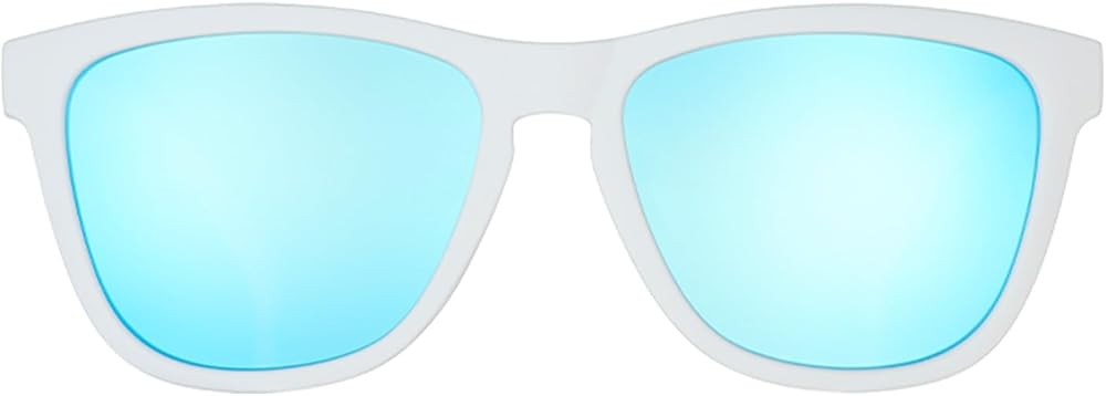 goodr Iced By Yetis Polarized Sunglasses for Men & Women, Medium Sized (OG), White Solid Frame with Blue Mirrored Reflective Lens, UV400 Protection, No Slip, No Bounce