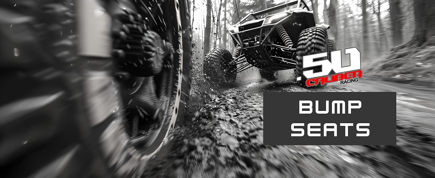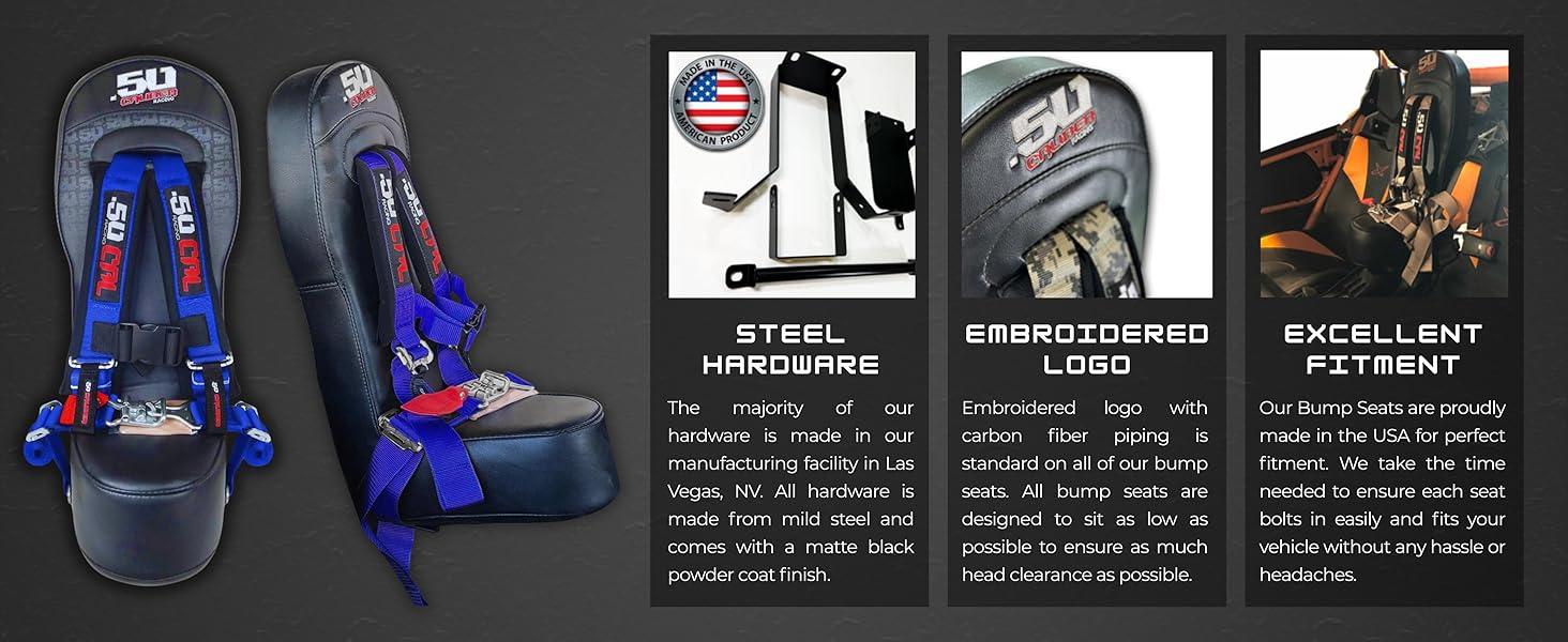 The 50 Caliber Racing General Rear bump seat with a 2" wide strap 4-point harness is designed to fit Polaris General 4 Seat models, offering a secure third seat for riders up to 60 lbs.