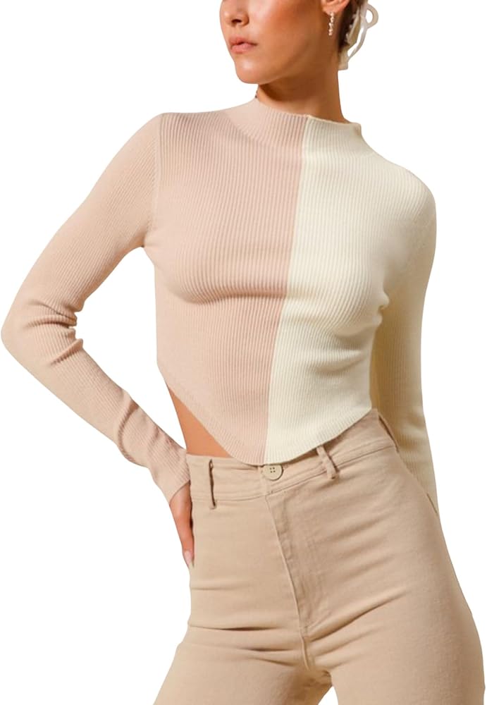This sophisticated dual-tone pullover features a premium ribbed knit construction with an eye-catching color block design. Made from high-quality stretch knit material that provides both comfort and style. The garment showcases a form-fitting silhouette with long sleeves and a high neckline. The neutral beige and cream color palette creates a versatile piece perfect for layering or standalone wear. The seamless color transition and ribbed texture add visual interest while maintaining an elegant, minimalist aesthetic. Ideal for casual to semi-formal occasions with its contemporary design and comfortable fit.