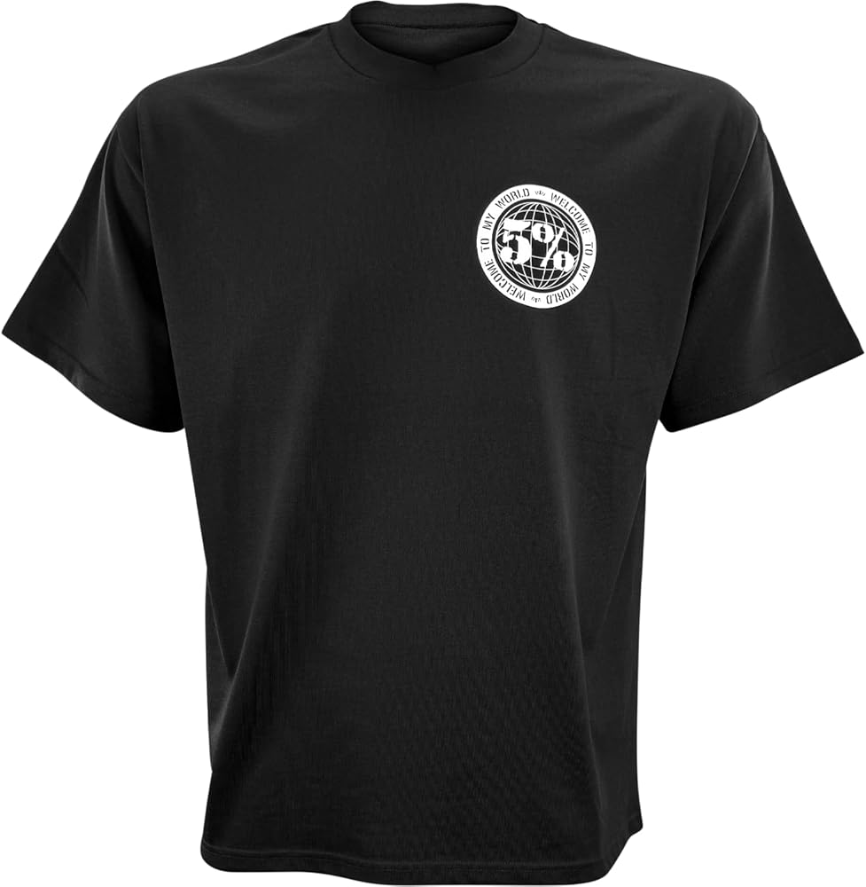 Black Shirt with White Circle Design on Chest; White Designs on Back
