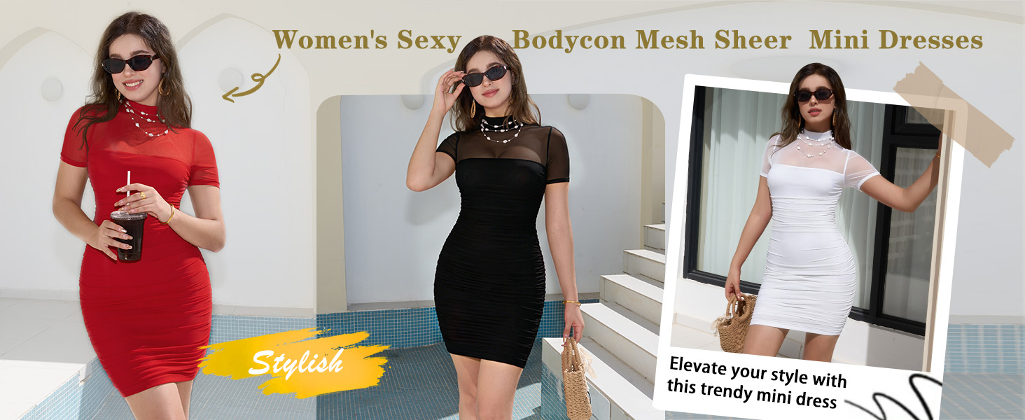 Fabric:This sexy bodycon mini dress is made of soft, sheer mesh fabric with high stretch. Lightweight, breathable, and comfortable to wear, it hugs your curves while allowing easy movement. Fully lined for added coverage and confidence.