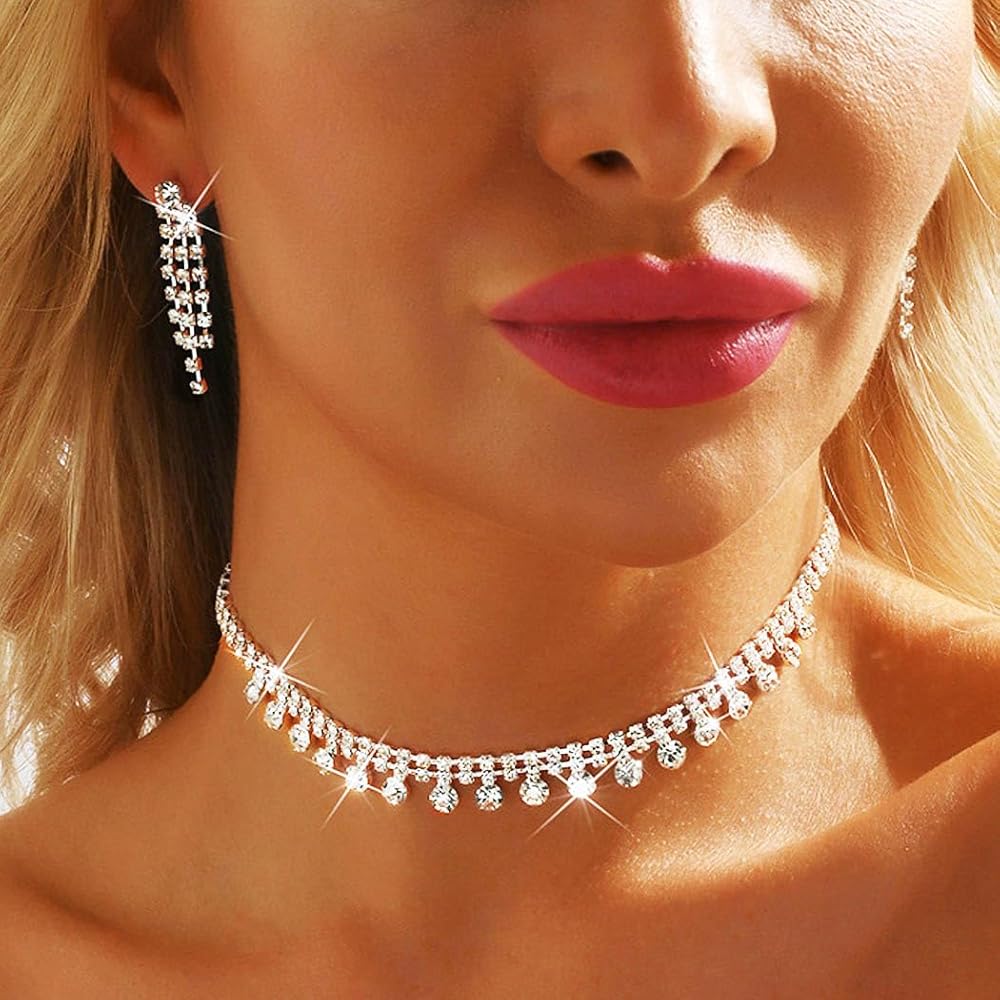 Yean Silver Choker Necklace and Earrings Set Rhinestone Bridal Choker Necklace Crystal Wedding Choker Jewelry Sets for Women