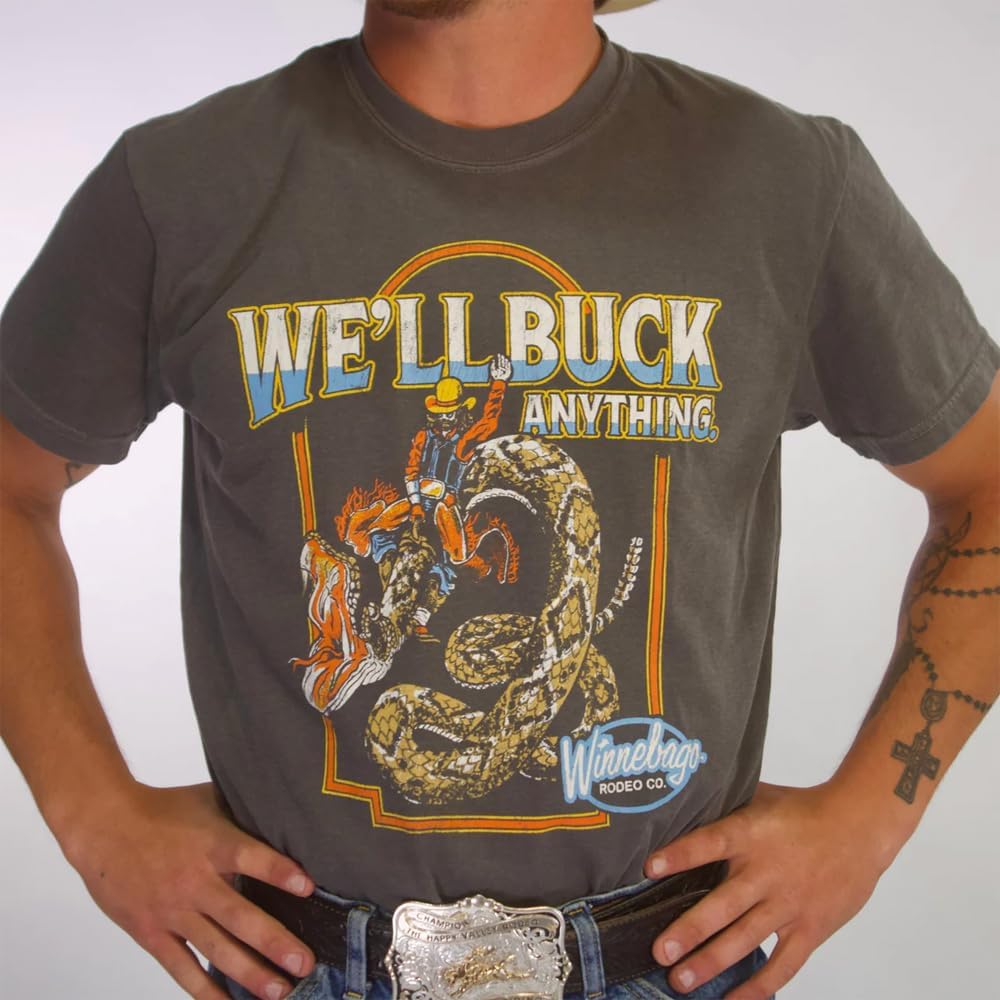 Official Dale Brisby Rodeo Time Shirt: Authentic "We'll Buck Anything" graphic tee from the Winnebago Rodeo Co., designed for true rodeo fans and Western lifestyle lovers.