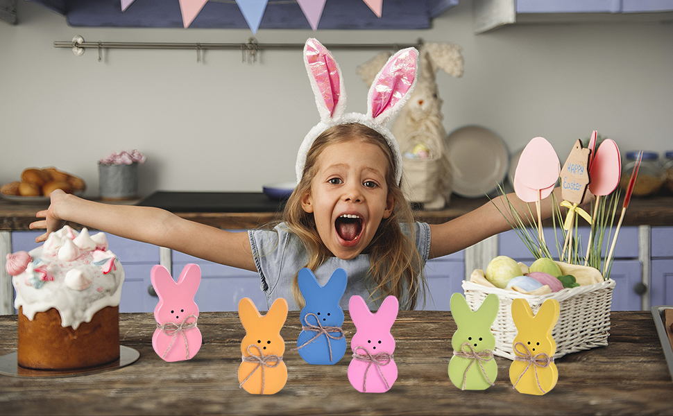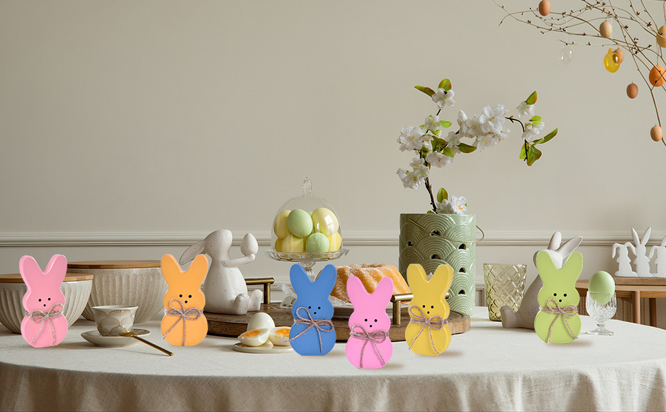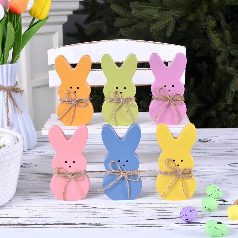 BRIGHT SIX-COLOR BUNNY SET FOR SPRING: This set features six wooden easter bunnies in green, pink, yellow, orange, blue, and peach, bringing playful charm to your easter decorations for home. Each bunny stands securely with a smooth finish, perfect for tiered trays, coffee tables, or shelves. Add them to your easter bunny decor to create a cheerful and heartwarming seasonal scene.