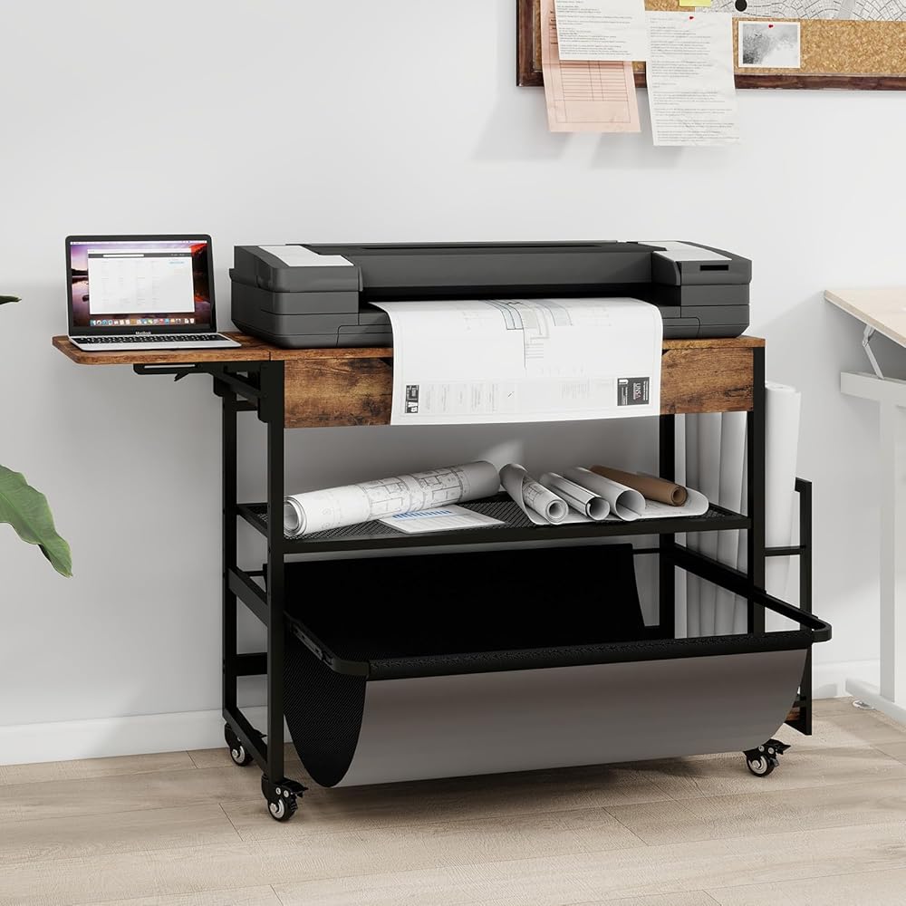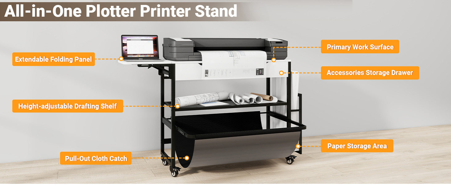 【All-in-One Storage Solution】 This wide format printer stand maximizes organization with an expandable desktop, provides paper rolls holder on right side, 2 of accessory storage drawers underneath, height-adjustable shelves for printed drawings, and a pull-out fabric pouch for immediate print collection.