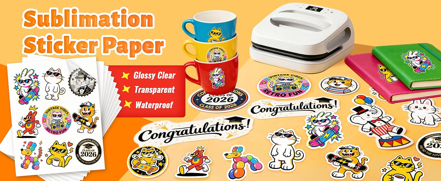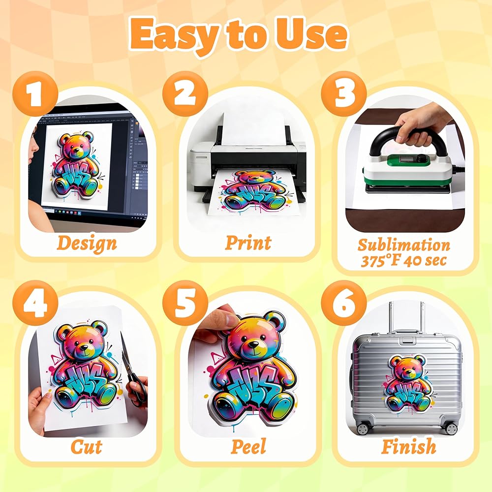 Sublimation Printer + Ink Required: Print your mirrored design on sublimation paper first, then heat press it onto the sublimation sticker paper sheet.Preheat your press for 5 minutes. Press at 375°F to 400°F for 40 to 60 seconds with light, even pressure, then adjust as needed.