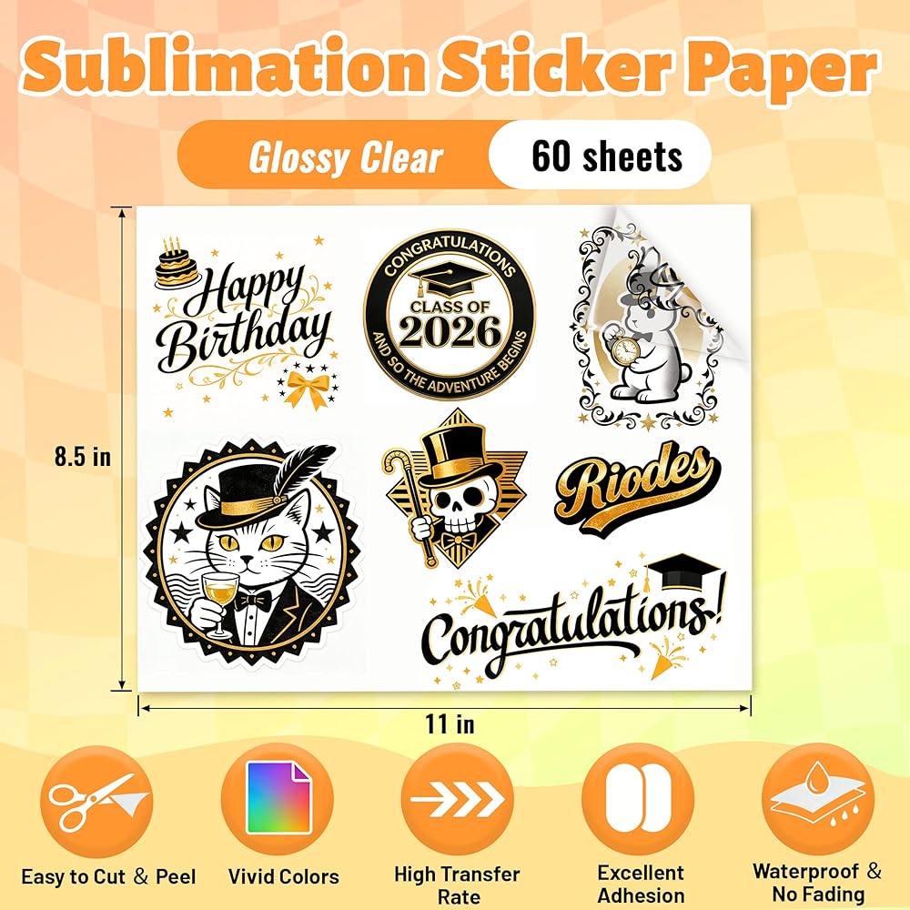 Joyclub Sublimation Sticker Paper, 60 Sheets 8.5x11 Glossy Transparent Waterproof Sticker Paper Vinyl for Sublimation Inkjet Printer and Heat Press, High Clarity for Mugs and Labels