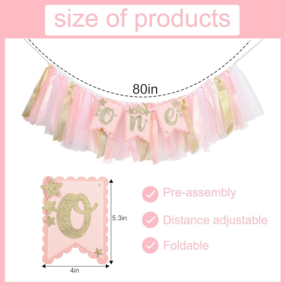 Pink gold high chair birthday banner, especially suitable for first birthday pink party supplies, birthdays, anniversaries, etc., leaving beautiful memories for your child. Remember to save your photos