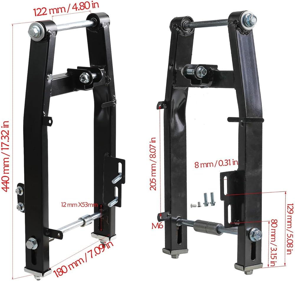 The kit includes a 12-inch rear wheel with a strong 1.85×12 rim and inner tube, providing excellent traction and shock resistance for off-road riding. The 440mm reinforced swingarm offers improved stability and handling, while the pre-bled rear brake caliper with 500mm hose delivers reliable stopping power.