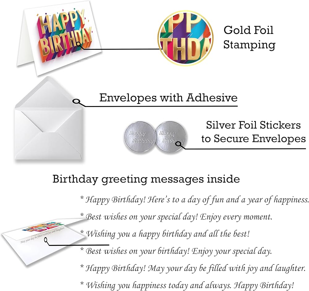 Celebrate Every Birthday in Style with Our 150 Bulk Happy Birthday Cards! Make birthdays memorable for colleagues, clients, friends, and family with this premium 150-card set. Featuring 6 elegant designs with gold foil printing, these cards offer a luxury feel that stands out from standard greeting cards. Each card is thoughtfully crafted with short, generic messages inside, making them suitable for office, business, personal, and employee gifting. The set comes complete with quality envelopes and matching stickers, all sized at 4 x 6 inches, ready for immediate use. Cards are neatly organized in a sturdy, beautifully designed storage box, keeping them safe, clean, and easy to access whenever you need them. Whether you're stocking up for your office, preparing for client appreciation, or simply want a versatile set for personal use, this bulk birthday card pack combines quality printing, elegant design, and convenience, making it a perfect gift solution.