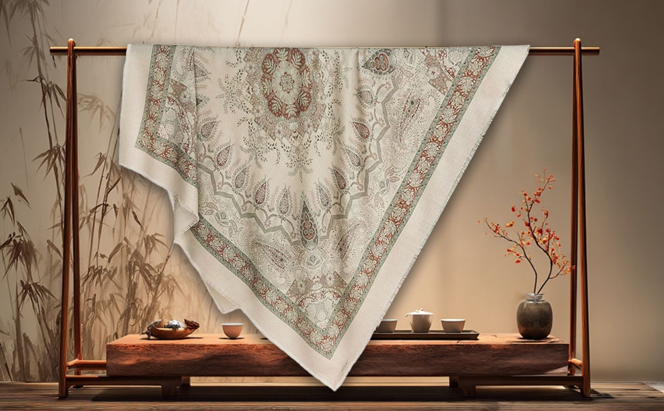 Exquisite Boho Paisley Pattern: Features a classic intricate mandala and paisley motif in rustic tones of beige, rust red, and sage green. The vintage-inspired print creates a sophisticated bohemian look that adds an artistic touch to your wardrobe. The edges are finished with delicate natural fringes.