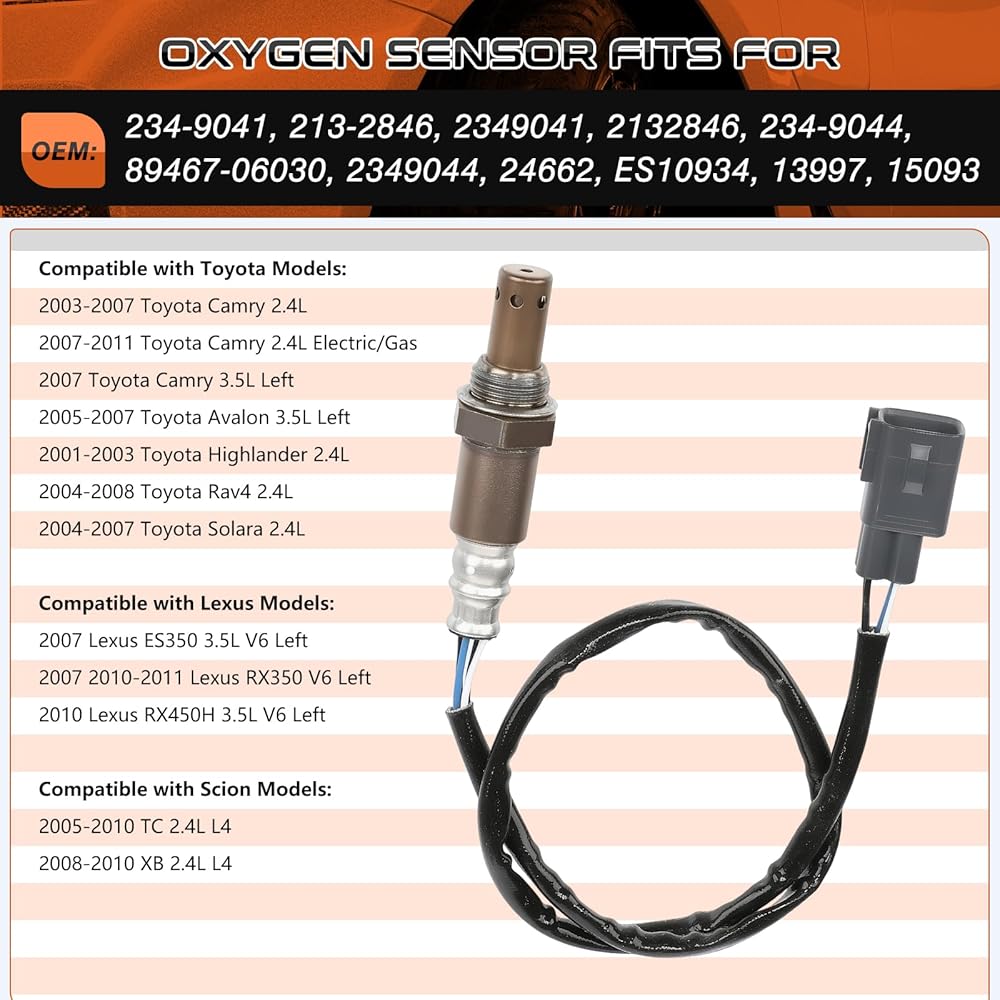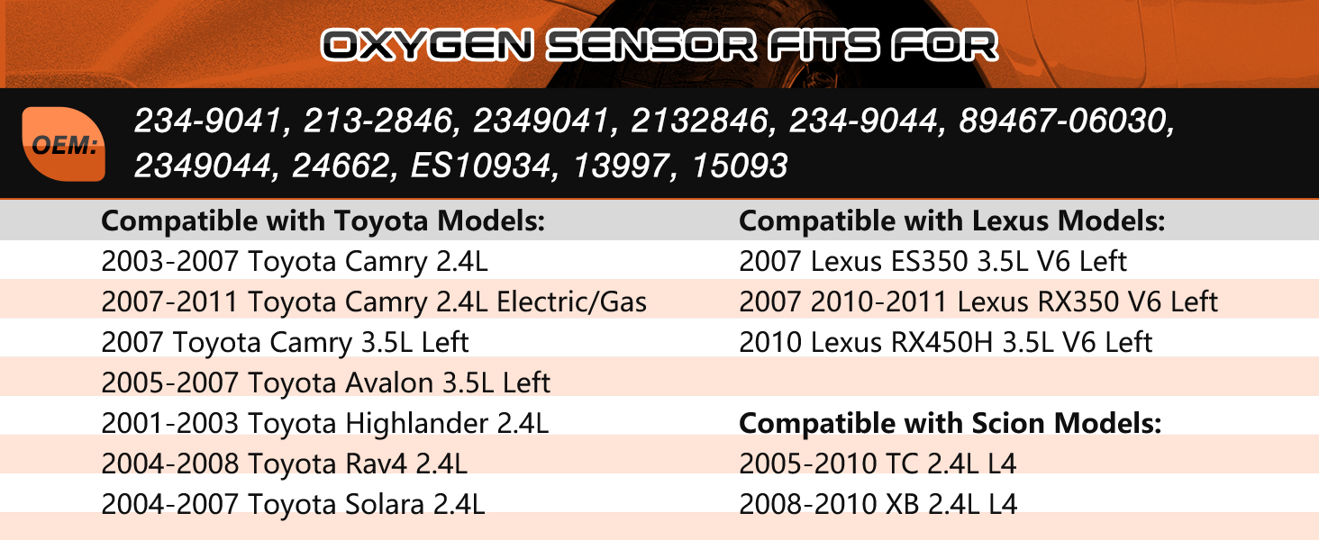 【Vehicle Fitment】ACAUTO Upstream oxygen sensor compatible with Toyota Camry 2.4L 2003-2011,Camry 3.5L 2007, Highlander 2.4L 2001-2003, Fit for Rav4 2.4L 2004-2008 ,Solara 2.4L 2004-2007 ,Avalon 3.5L Left 2005-2007; Fit for Scion TC 2.4L 2005-2010, XB 2.4L 2008-2010 ; Fit for Lexus ES350 3.5L Left 2007, RX350 3.5L Left 2010-2011,RX450H 3.5L V6 Left 2010.