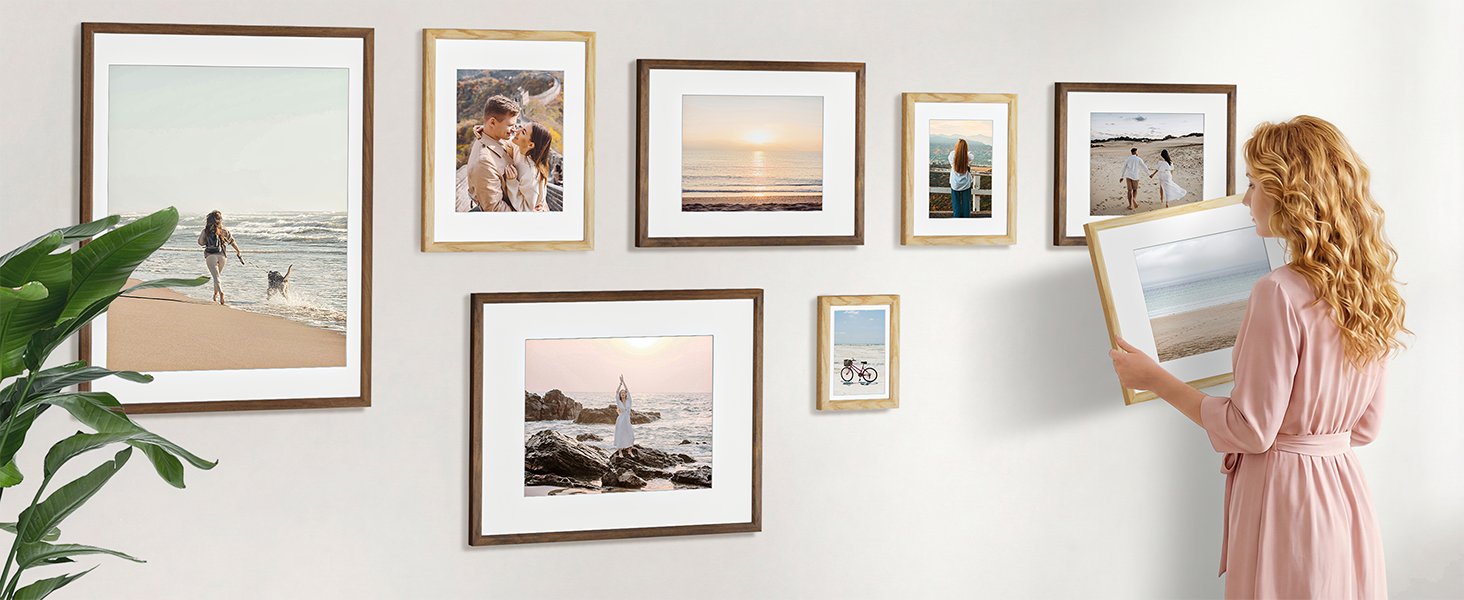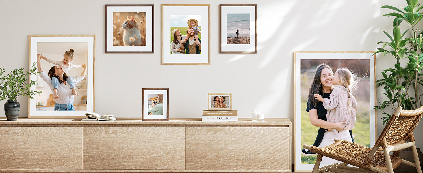 Wall or Tabletop Display: Offers versatile placement options to showcase your memories anywhere. Each real wood frame comes with built-in wall hangers for secure mounting and a sturdy folding kickstand for easy tabletop display. Effortlessly switch between horizontal or vertical orientations to complement any space or style.