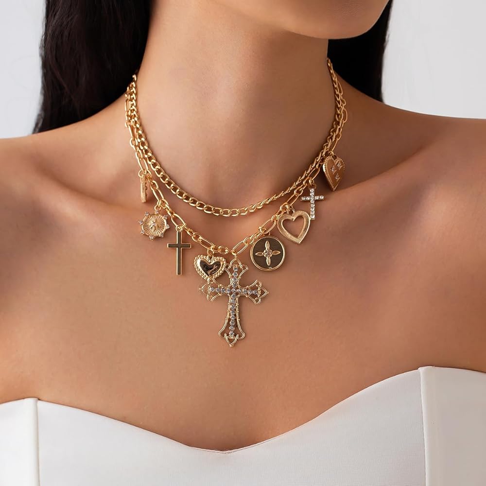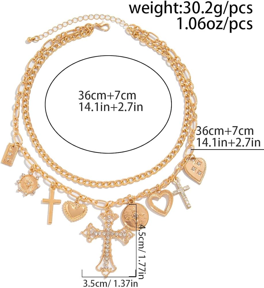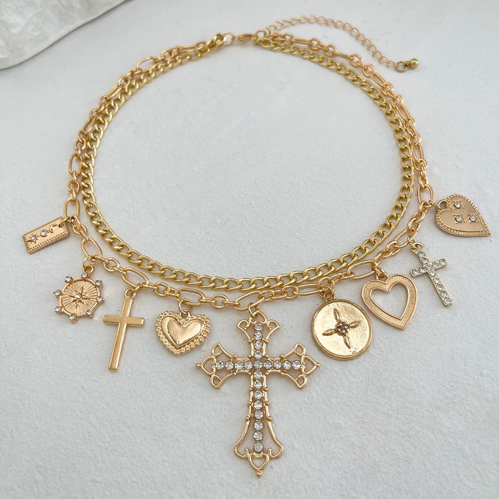 Shape Features: Bold layered chunky link choker decorated with mixed charms—hearts, lock, coin medallion, and a crystal-paved cross shape centerpiece.