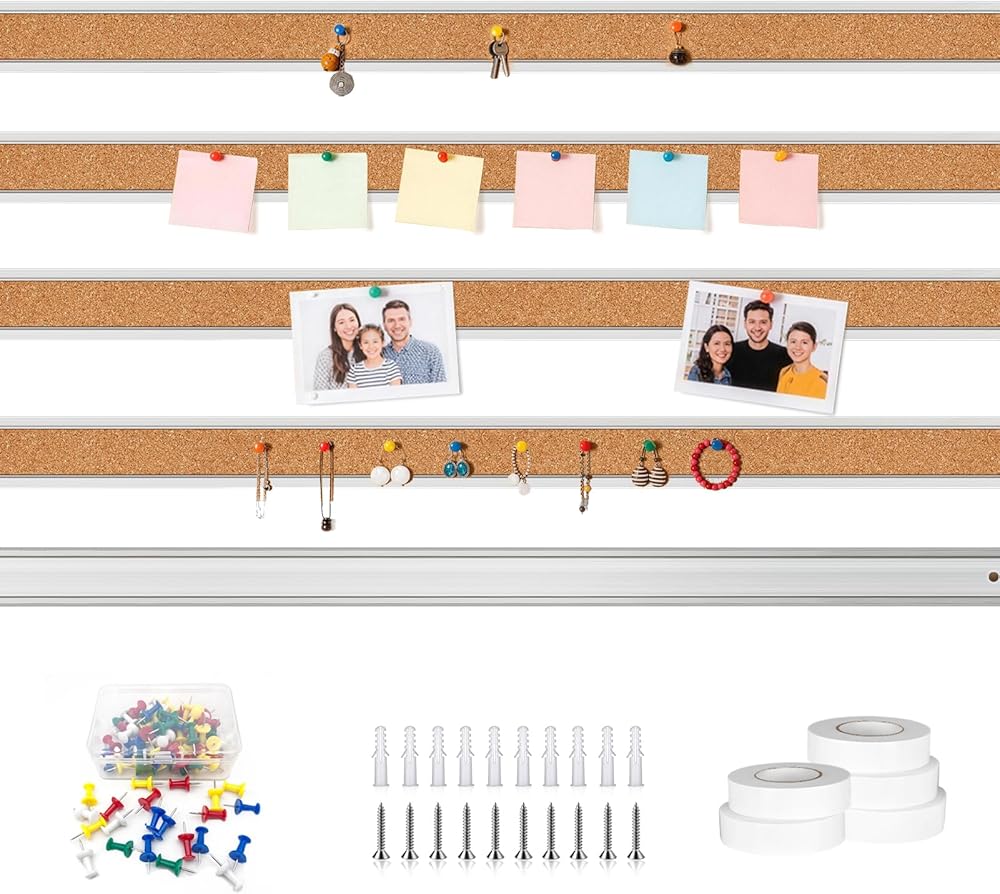 Corkboard Strip Set: Our set includes 5 cork board strips measuring 45.66 x 1.18 inches, 5 adhesive strips, and 10 mounting screws—no additional accessories needed. It also comes with a box of thumbtacks for easy content replacement anytime