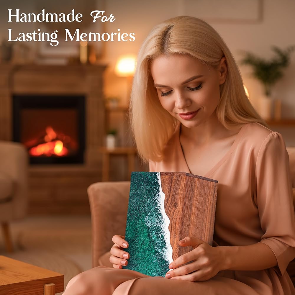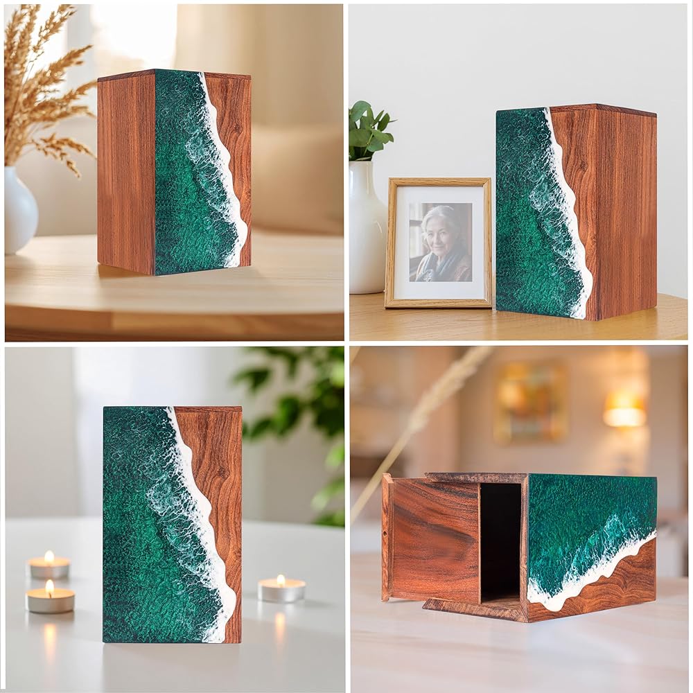 HANDMADE WOODEN CREMATION URN – Expertly crafted wooden urn from premium wood, this urn offers a durable and dignified resting place for human ashes with an elegant, timeless finish.
