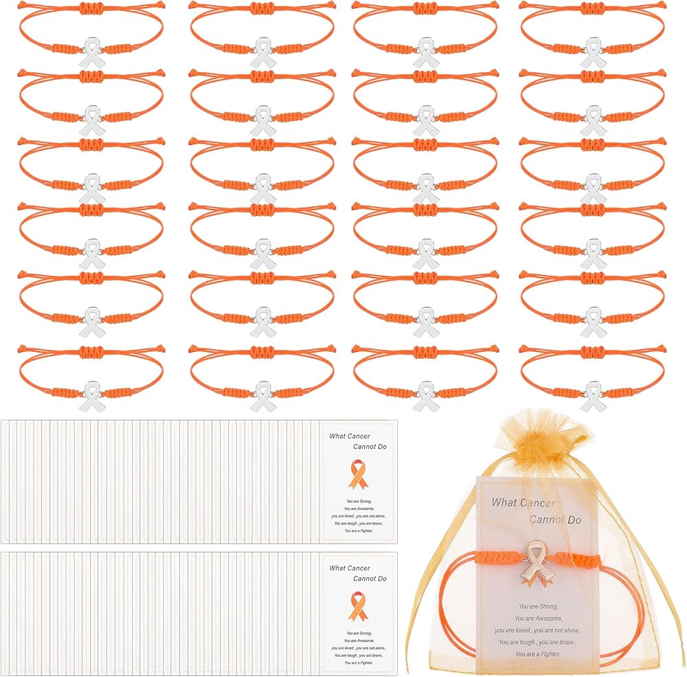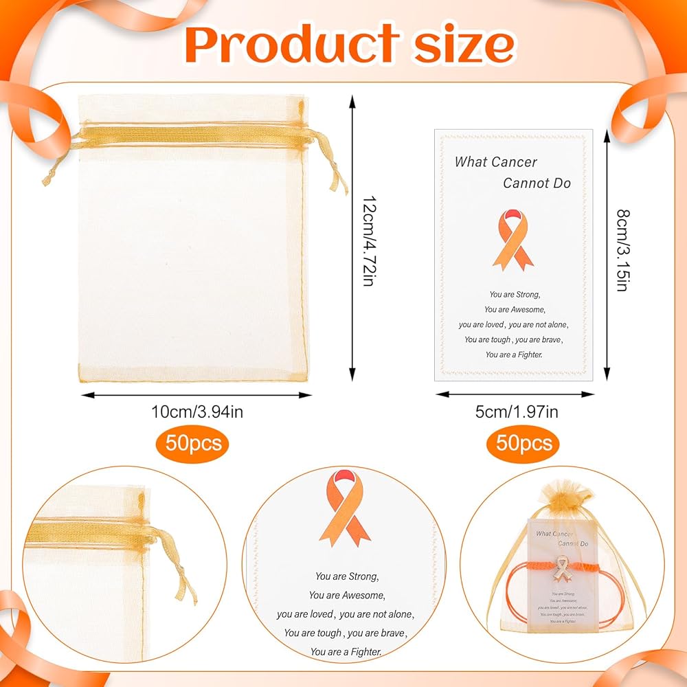 • 【Leukemia Awareness Products】Value-packed set includes 50 Orange Leukemia Awareness Bracelets, 50 inspirational cards, and 50 orange drawstring organza bags–everything needed for fundraisers, support groups, or meaningful gifting. Awareness bracelets are not just stylish accessories; they carry deep meaning and are often used to promote awareness and support for various causes.