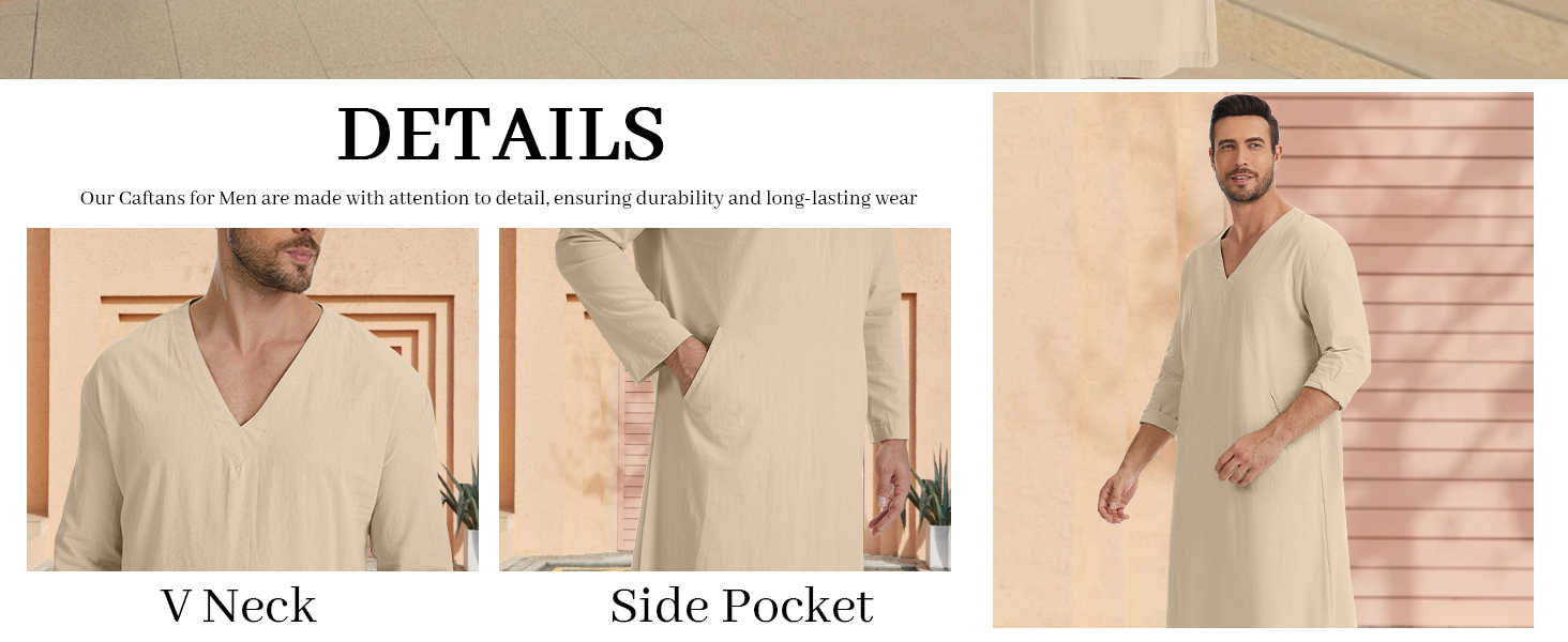 يتميز هذا المنتج من الملابس الرجالية الإسلامية بأنماطه الفريدة وملاءمته المريحة، ويعالج مشكلات المقاسات الشائعة الموجودة في العلامات التجارية الأخرى؛ إنه يمثل خيارًا متميزًا لأولئك الذين يبحثون عن ملابس إسلامية عالية الجودة للرجال تجمع بين الإيمان والموضة