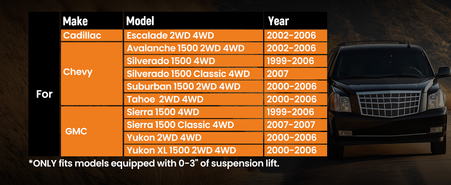 [Fitment] for Chevy Silverado/GMC Sierra 1500 Classic 4WD 1999-2007, for Chevy Avalanche 1500/Cadillac Escalade 2002-2006, for Chevy Suburban/Tahoe & GMC Yukon/Yukon XL 1500 2WD/4WD 2000-2006