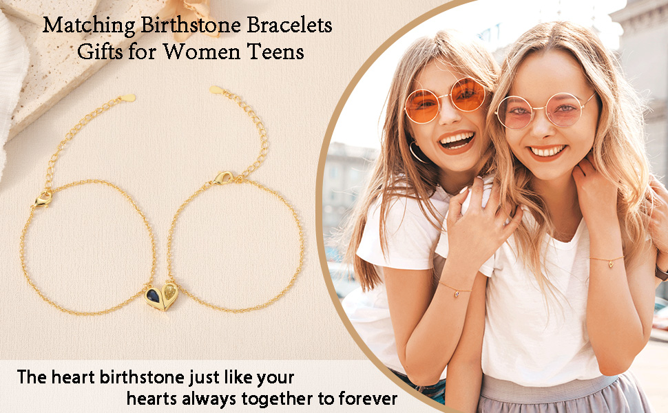 Birthstone Bracelet: Matching gold bracelets for women and teens, special design with two birthstone charms for one heart, 1-12 birthstone available for your month