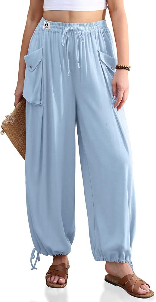 Loose linen cargo pants for women made from breathable linen blend fabric, soft and skin-friendly, providing a cool and relaxed feel for all-day wear in spring and summer