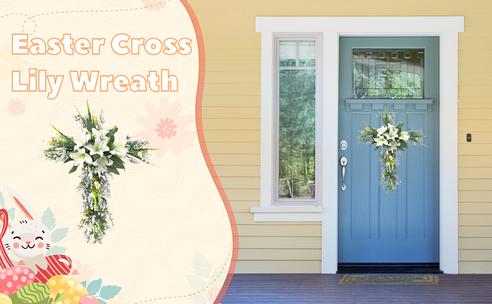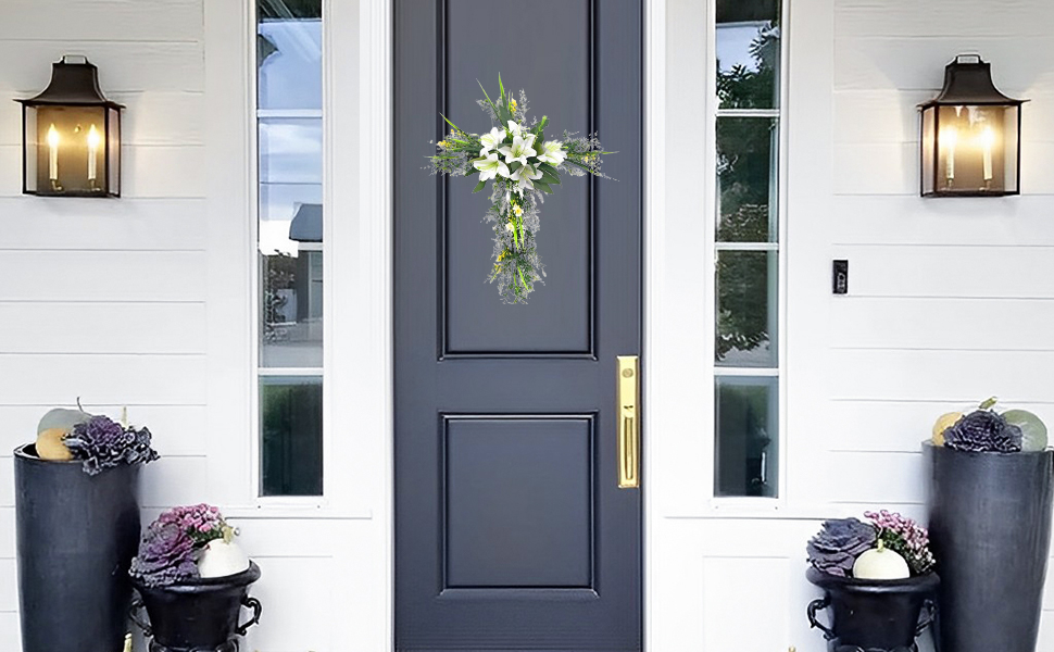 - 【Cross Shape】Easter Front door wreath with cross shape and artificial lily flowers to welcome your friends, neighbors and family