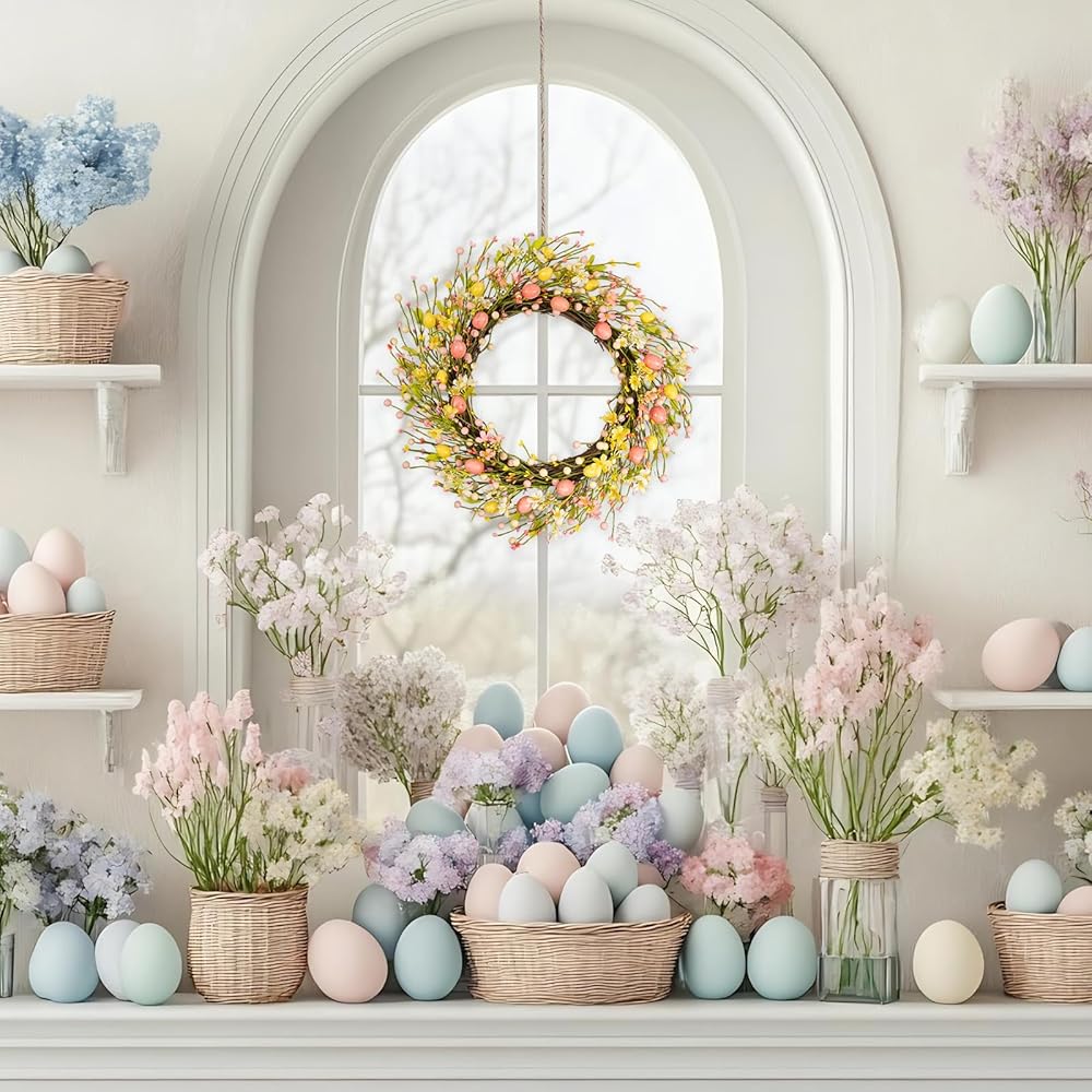 Timeless Easter & Spring Design – Celebrate the season with a classic 22-inch wreath featuring pastel pink and yellow Easter eggs, delicate fabric wildflowers, and natural berry sprigs. Perfect for bringing cheerful farmhouse charm to your front door, porch, or indoor wall