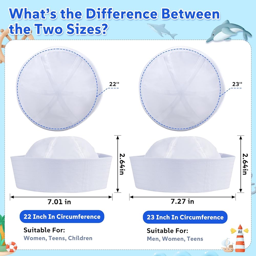 Product Size: The white sailor cap has a circumference of 23 inches, fitting most adults and teenagers. If it feels too loose when worn, it can be secured with clips to ensure a comfortable and snug fit.