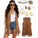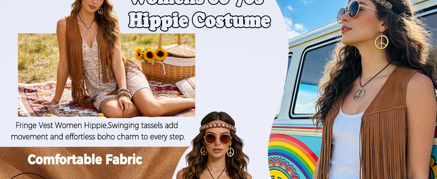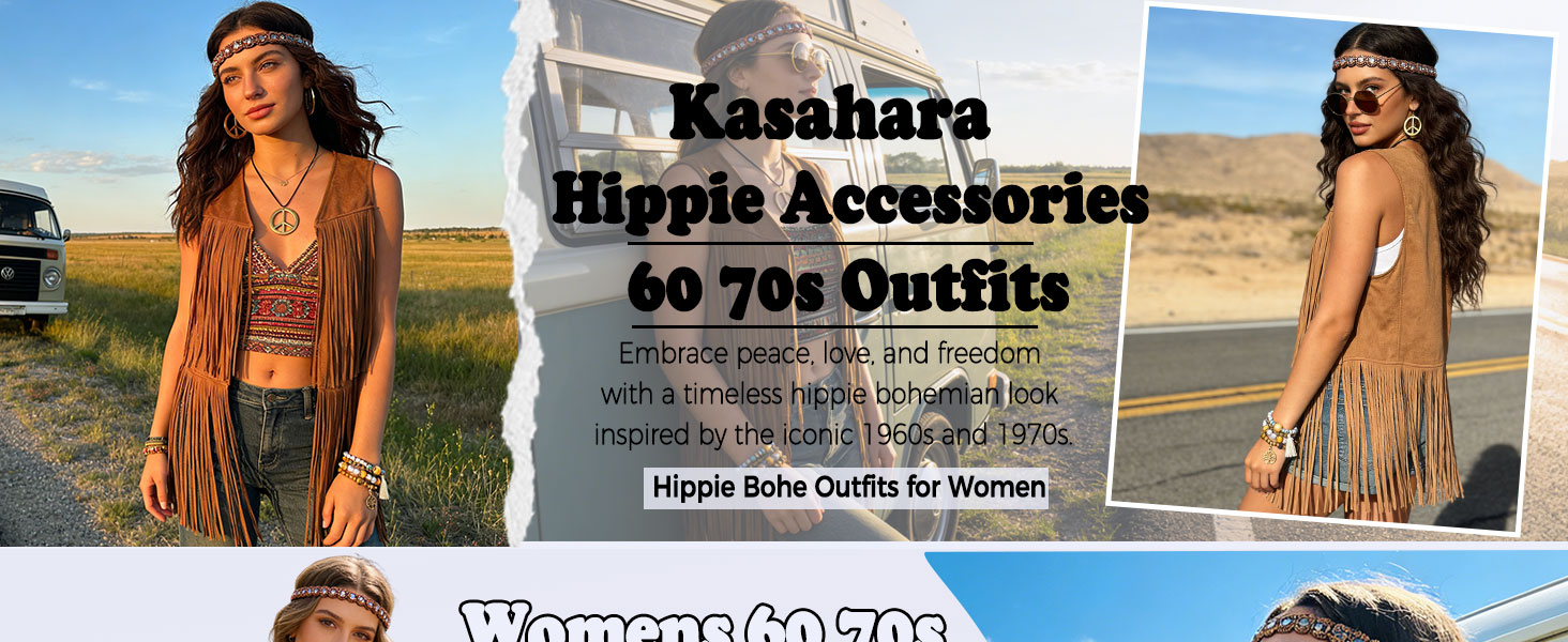 Hippie Clothes for Women: 6-piece hippie accessories for women includes a fringe vest,a peace sign necklace and earrings, boho crystal headband, retro sunglasses, boho stackable beaded bracelet, full 60s 70s outfit for themed parties, festivals