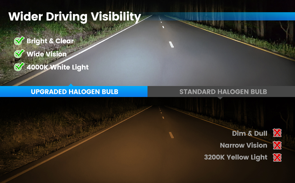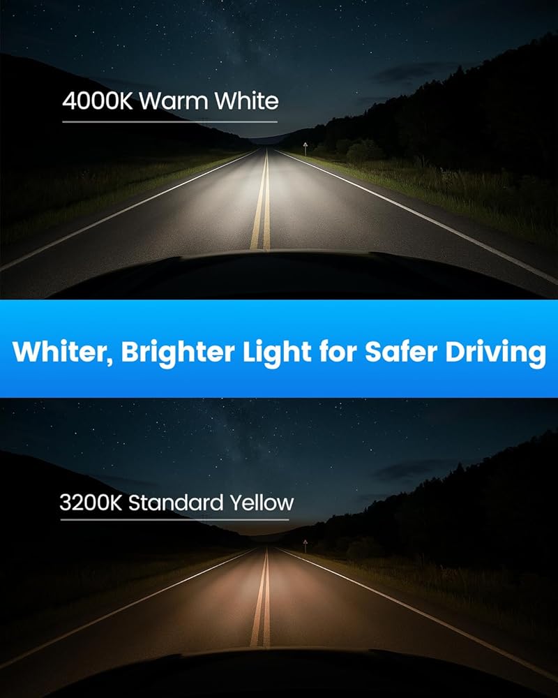 Warm White (Soft Tone) Upgrade – Dual blue-and-clear coating creates a soft warm-white look that appears cleaner and less yellow than standard halogen, improving clarity while maintaining comfortable road illumination. Color may vary slightly by vehicle voltage.