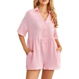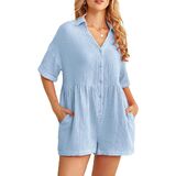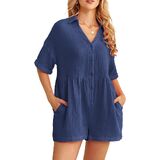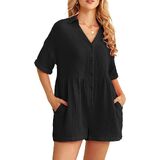 [Features]: This shorts rompers have a basic collared, short sleeve and cuffed hem which make you feel very comfortable indoors and out. Rompers for women feature a v neck, button down, loose fit, solid color, two slide pockets, . wide leg jumpsuits for women, short jumpsuits for women, jumpsuits for women casual