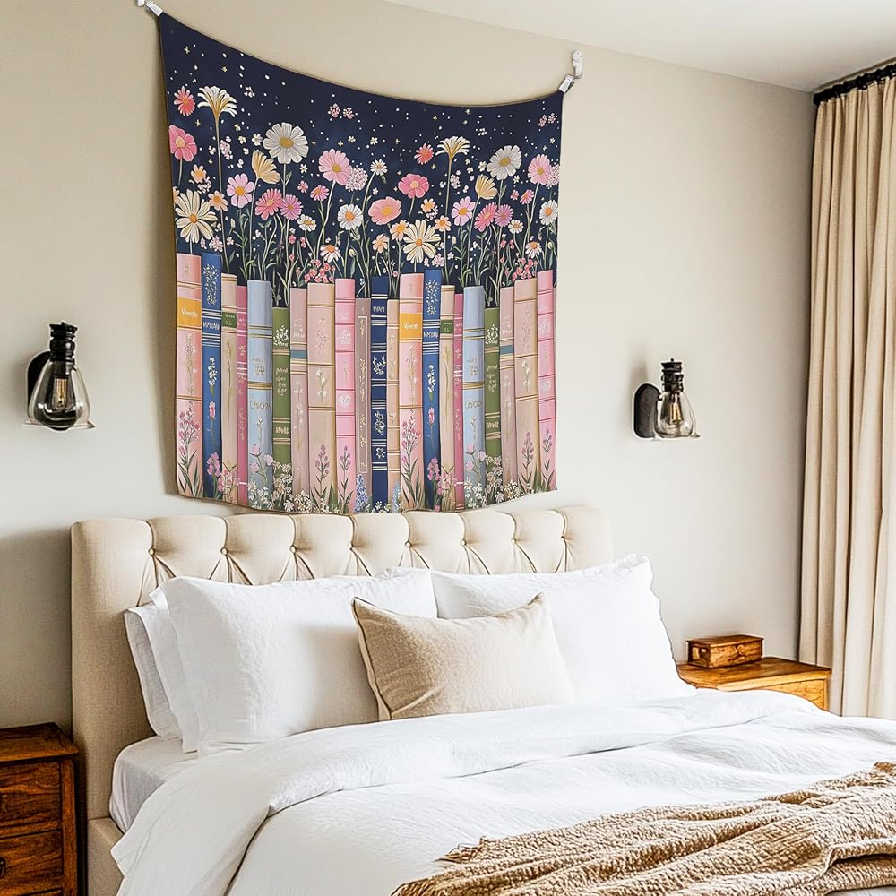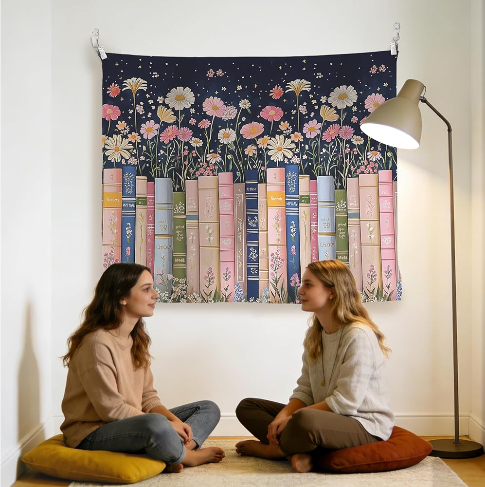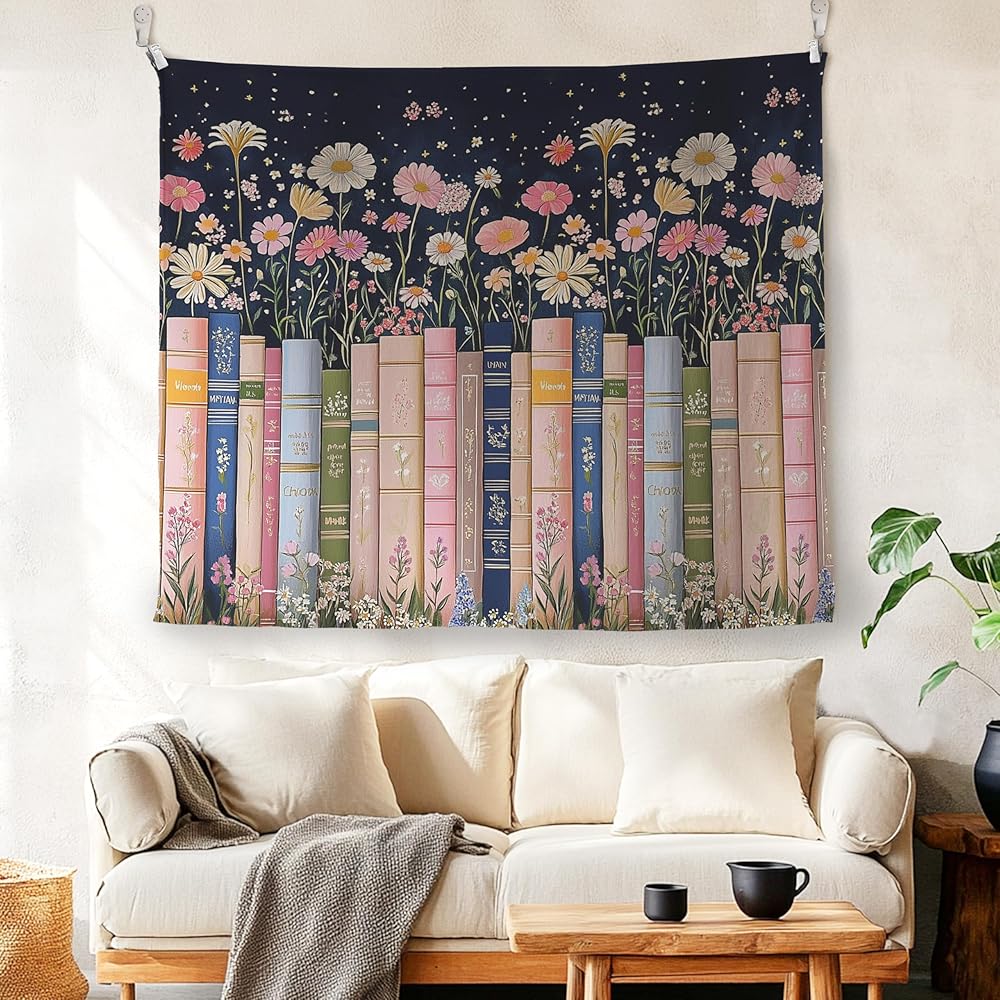 LADOCK Fantasy Floral Book Wall Tapestry, Reading Nook Corner Room Decor, Cottagecore Bookish Tapestry Wall Hanging Decor for Girls Bedroom Home Library Classroom, 50x60 Inch