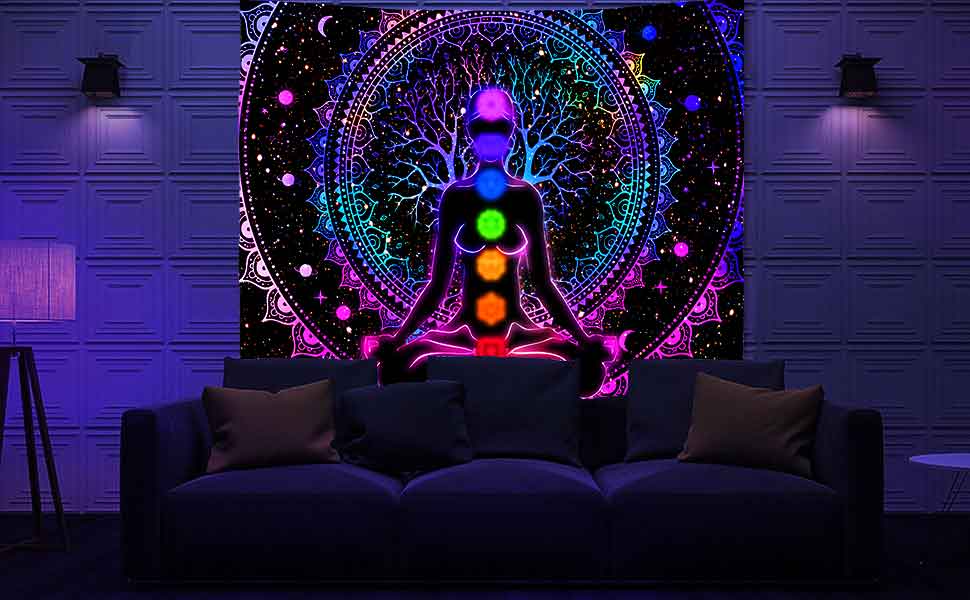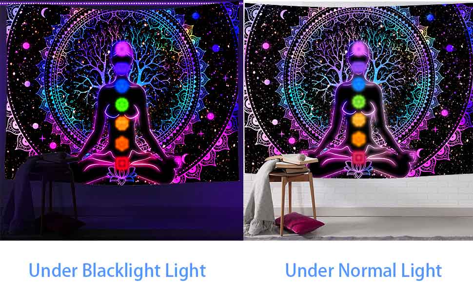 UV/Blacklight Reactive:This Black Light Seven Chakra Tapestry has patterns of Starry night,moon,wildflower, mushrooms and waterfall . The colors are vibrant under natural light, and even more vivid under black light. The colors are very dreamy and make your night no longer just black.