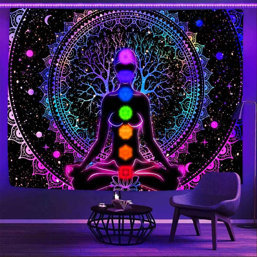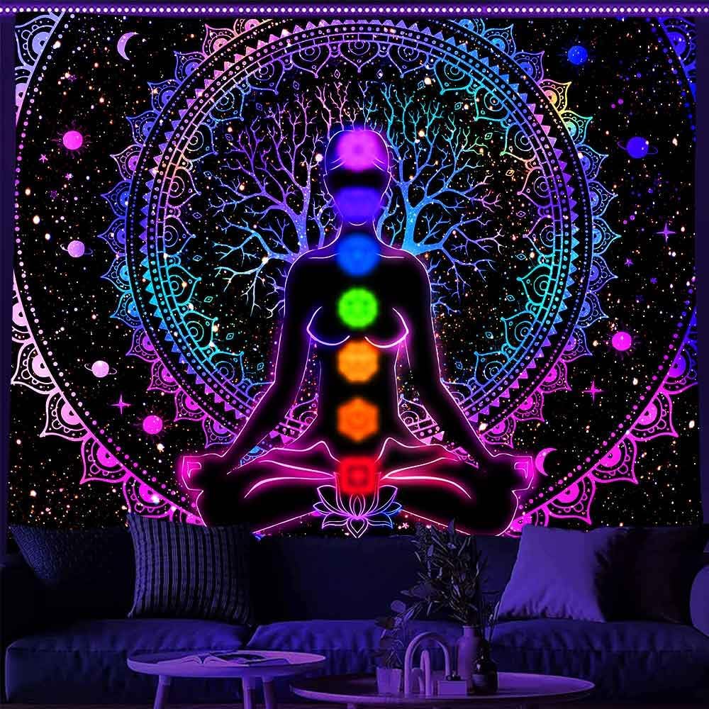 Ine Ive Blacklight Chakra Tapestry Boho Mandala Yoga Meditation Wall Tapestries 80x60Inch UV Reative Trippy Galaxy Space Spiritual Wall Blanket for Bedroom Office Home Decor
