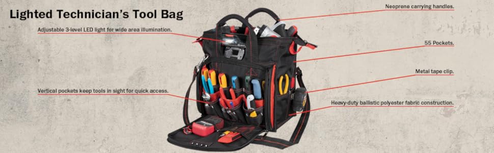 The Lighted Technician's Tool Bag with 3 level LED lights (39 lumens) allows for work in low light conditions when you need to complete a project or look inside your bag.