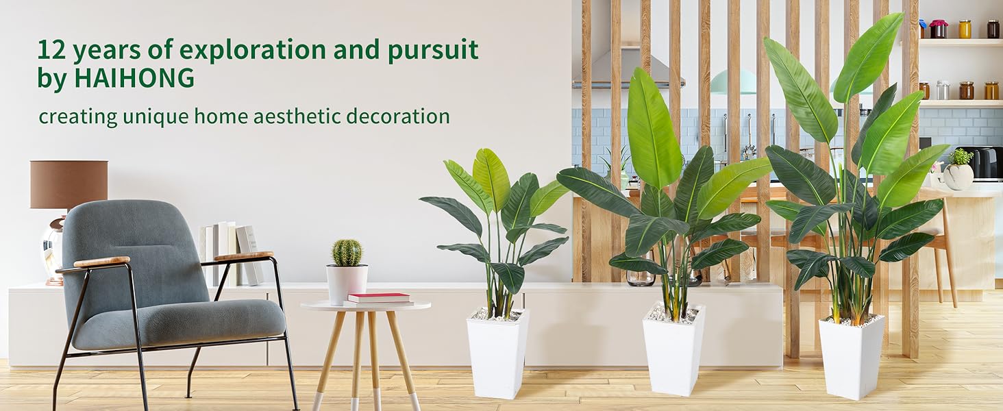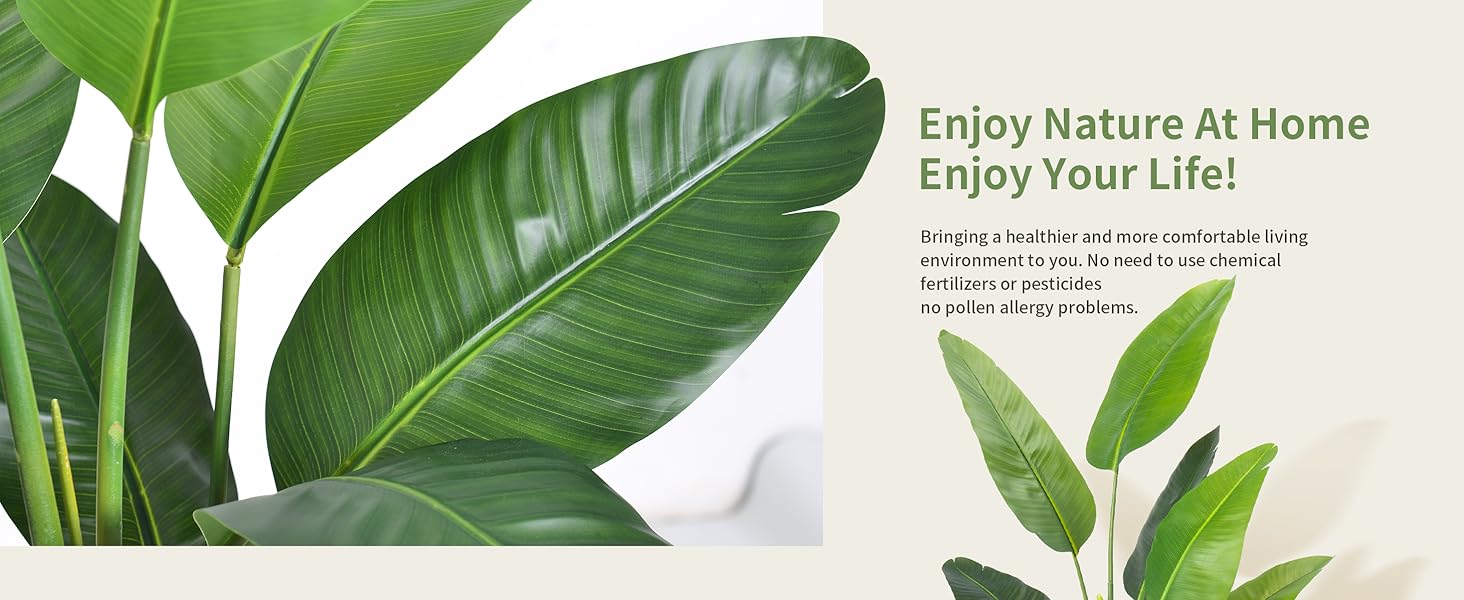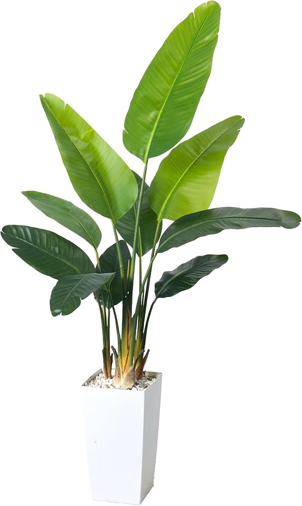 Vivid Artwork: Artificial bird of paradise Plants Artificial Tree with lifelike trunks,and naturally textured banana leaves. Developed and manufactured by a strong engineering enterprise that has been grinding for twelve years, the sturdy polyester trunk ensures long-term durability. The newly white planter is decorated with small stones by the river, and filled with sturdy cement to keep the tree upright and prevent tipping. This fake tree is a perfect example of a good quality artificial tree.