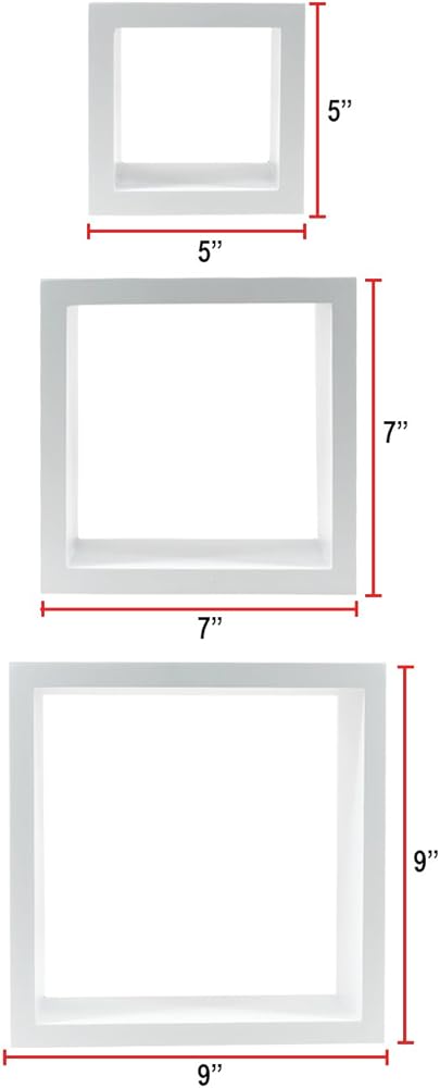 EASY TO INSTALL — Made of beautiful faux wood with a smooth matte finish — Attaches firmly to the wall without visible support — Minor assembly required — Mounting Hardware INCLUDED — Wipe clean with a dry cloth — Set of 3 square shelves, in different sizes — Measures approximately: Large 10”, Medium 8”, and Small 6” inch square (Depth interior, from front to back is 3.50")