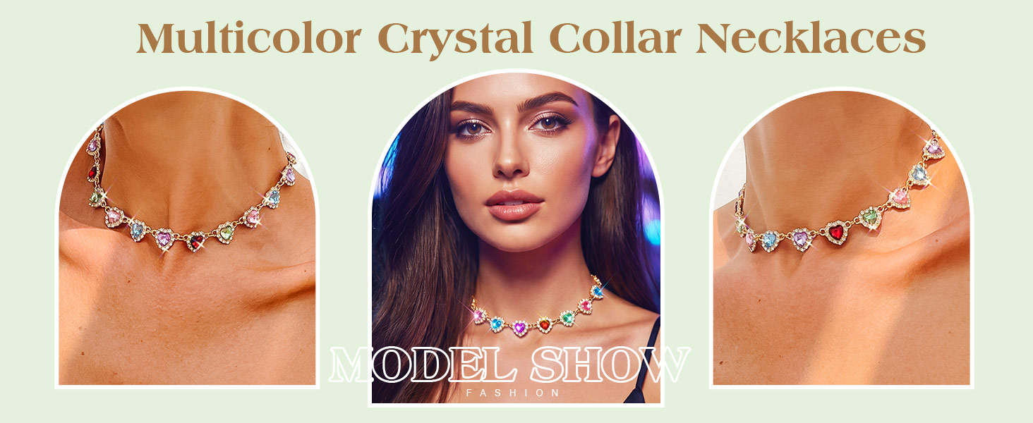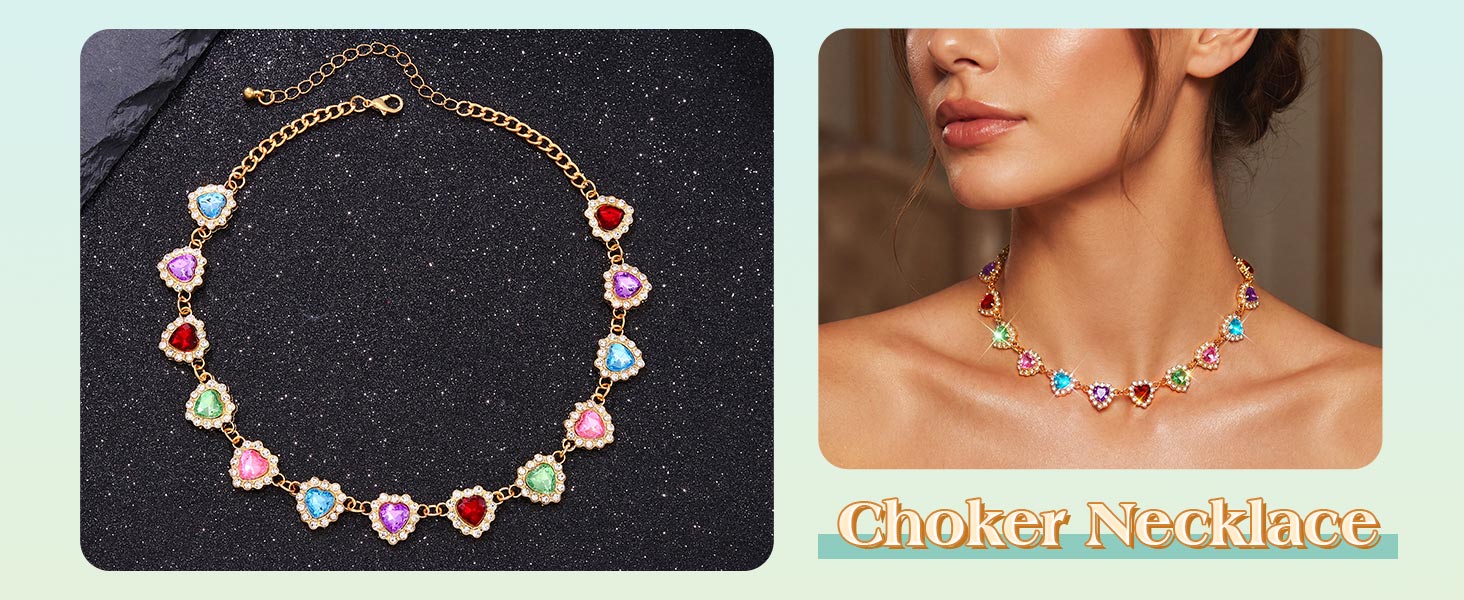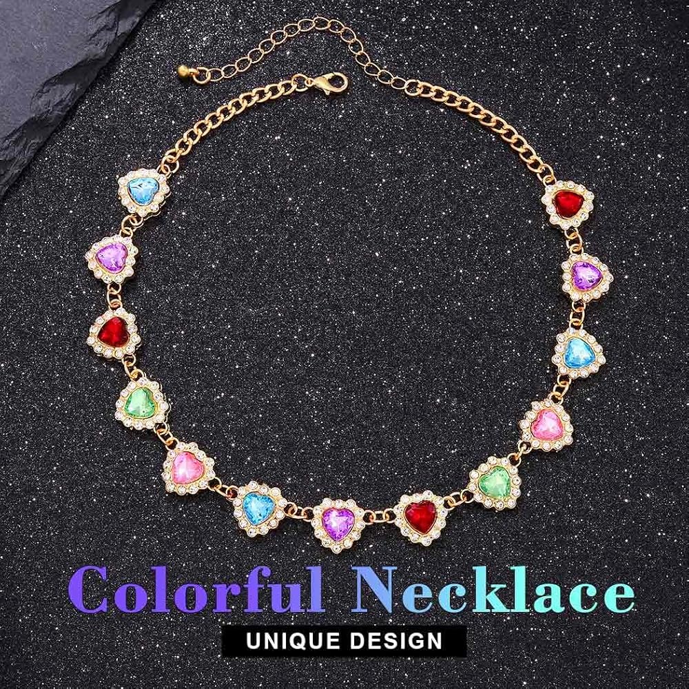 - Rainbow rhinestone choker features heart-shaped multicolor crystals in gold-plated setting, sparkling for daily/party wear.
