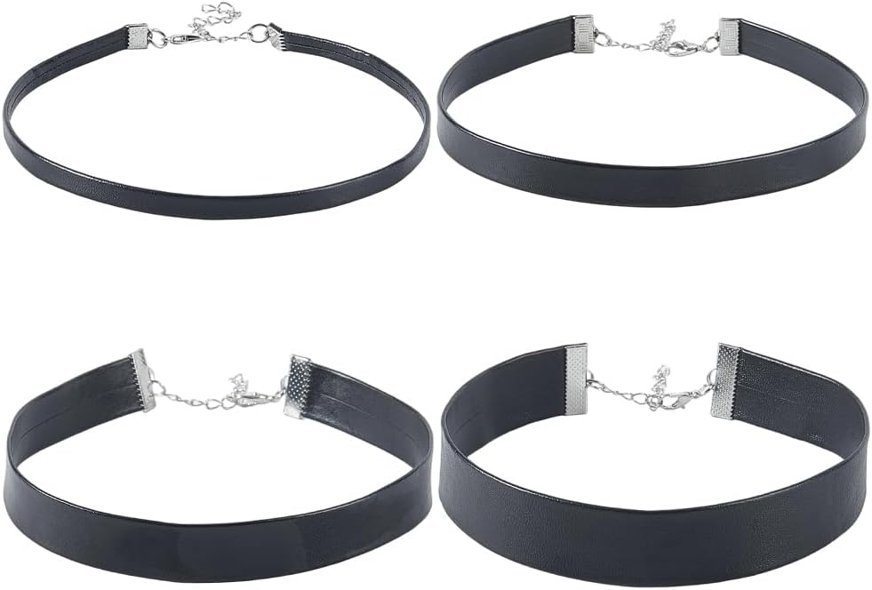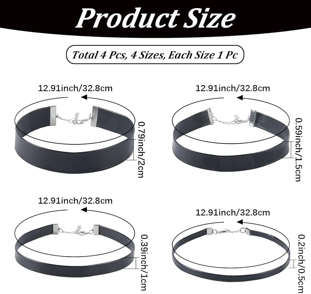 4 Sizes Choker Set: The package comes with 4pcs leather chokers, each is about 12.91 inch(32.8cm) long, and the width is about 0.2-0.79 inch(5-20mm), each size 1pc, which is easy to wear and take off, suitable for daily use