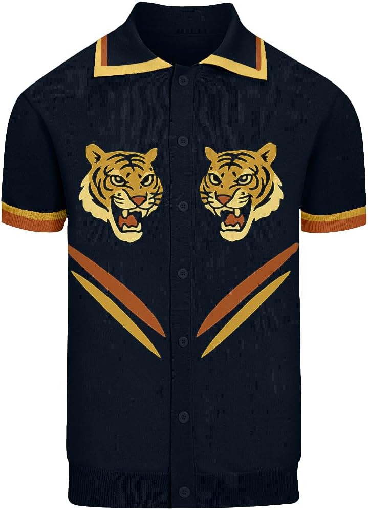 OXKNIT Men's Knit Polo Shirt, Retro Tiger Pattern Cardigan Polo Button Down Short Sleeve Shirt, Dark Blue in Kuwait