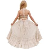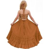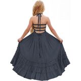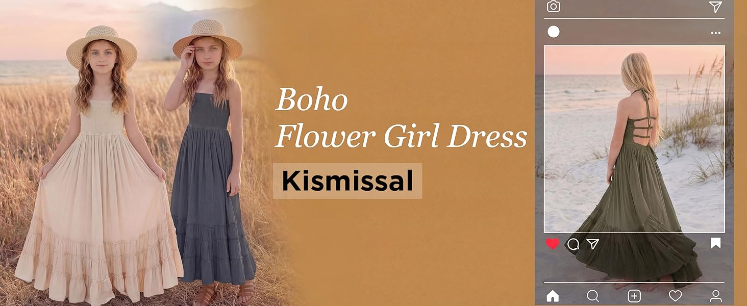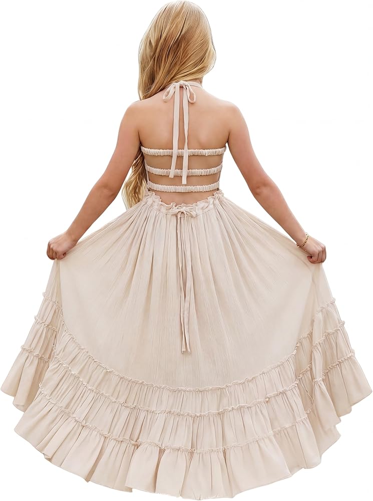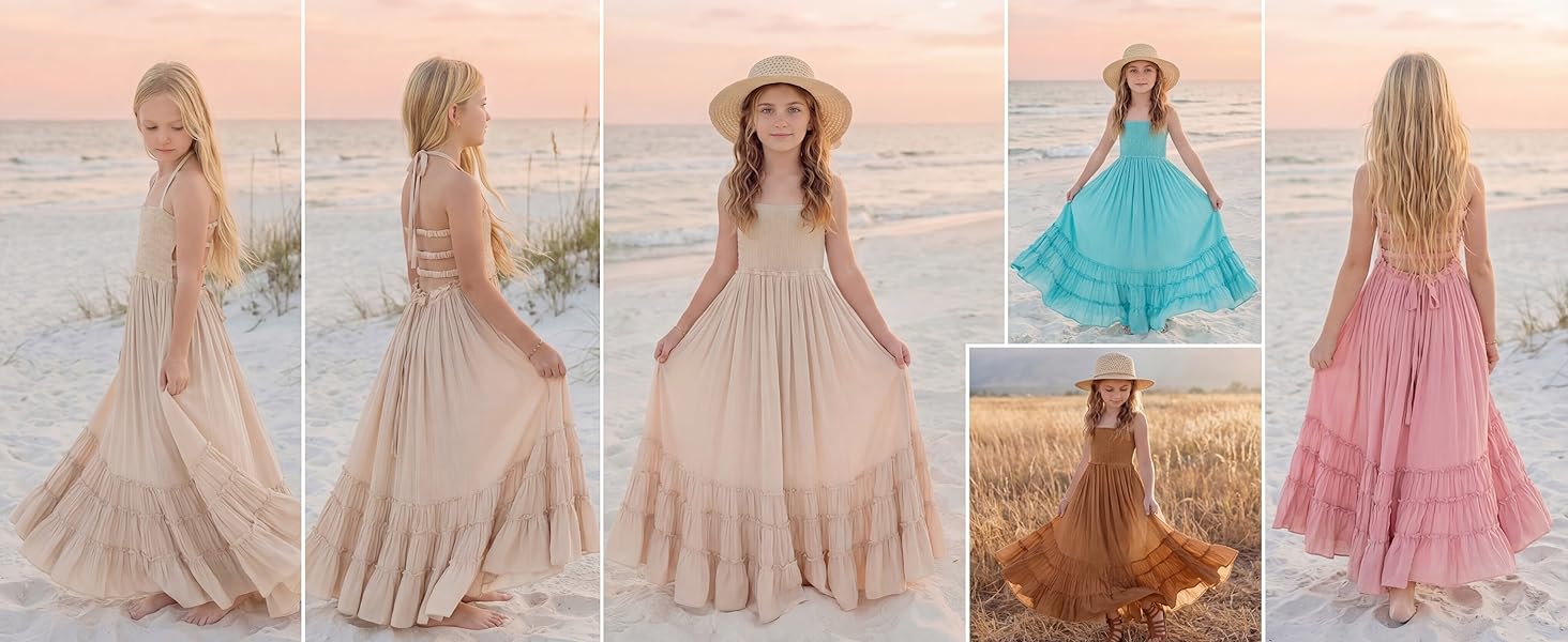 FEATURES: Maxi length, soft cotton material, solid color, A-line silhouette, full lining, sleeveless, backless, smocked design, and halter spaghetti straps. This toddler girl's beach wedding dress features tie straps and a flexible smocked top, making it easy to wear. Available for beach, holidays, or daily wear, this is a dress she's sure to love. This boho flower girls' semi-formal dress is available for 2-12-year-old girls